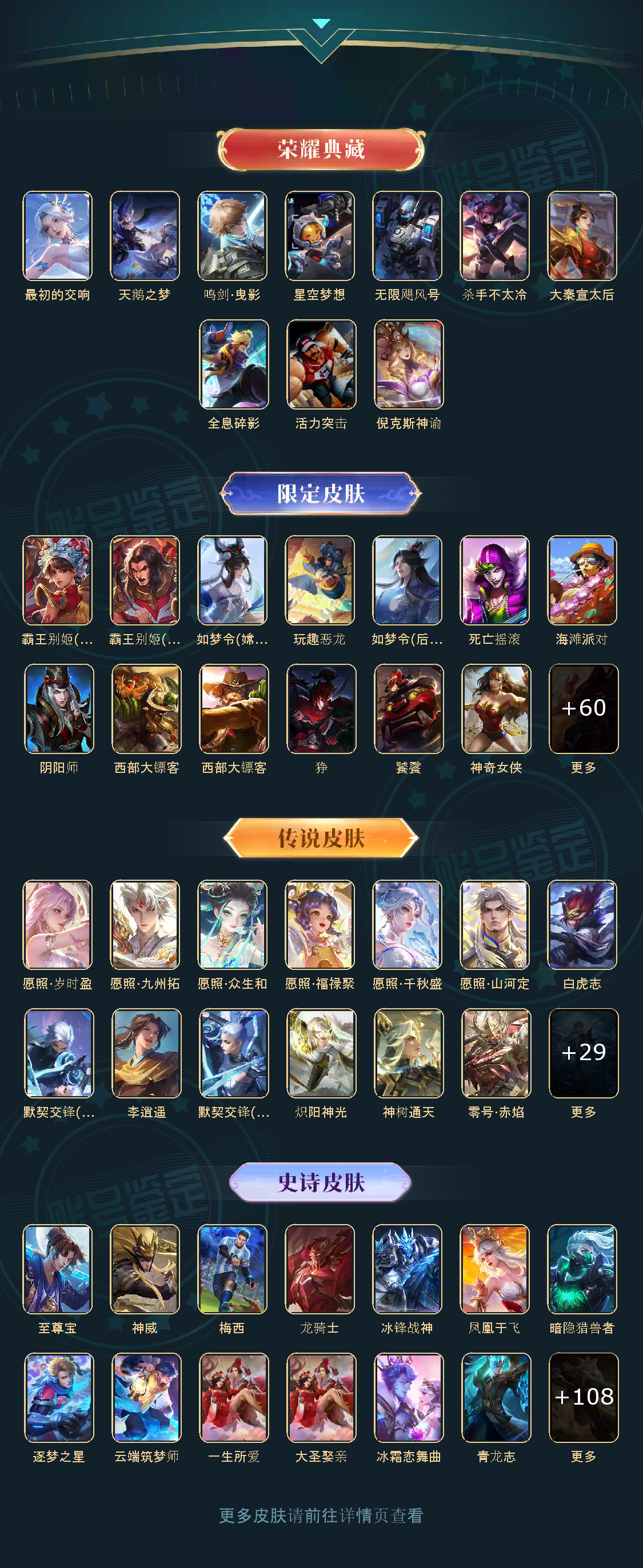 贵族等级V10,段位最强王者,英雄数量123,典藏皮肤数9,皮肤数量376,至尊宝/梅西/青龙志/白虎志/朱雀志/久胜战神/飞衡/鸣剑·曳影/李逍遥/武圣/神威/炽阳神光/时雨天司/至尊宝/梅西/青龙志/白虎志/朱雀志/久胜战神/飞衡/鸣剑·曳影/李逍遥/武圣/神威/炽阳神光/时雨天司