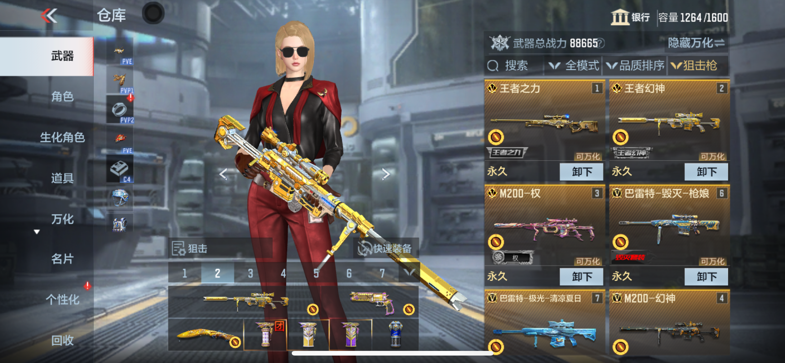 🔥狙击枪:王者幻神✨王者之力➕燃竞命中数字✨王幻✨巴雷特能量核心✨巴雷特毁灭不屈老兵+音效卡✨巴雷特极光✨AWM天使✨AWN游骑兵✨98K星神✨98k蜻蜓(狙击枪线)