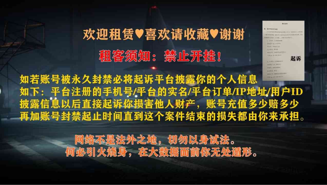请勿使用外挂,非官方安装包,改肤软件等非法插件启动游戏,照成账号封禁必联系平台提供资料追究法律责任! 文明游戏切勿开G,切勿以身试法。通过正常升级充值获得装备的游戏账号,属于个人财产,受法律保护。《刑法》第二百七十五条规定故意毁坏公私财物,数额较大(5000元以上)或者有其他严重情节的,处三年以下有期徒刑、拘役、或者罚金;数额巨大或者有其他特别严重情节的,处三年以上七年以下有期徒刑。如出现任何有损账号的行为导致账号封停,我们会将恶意租客的注册手机号、姓名、身份证信息和登录游戏ip地址提交给公安局进行立案,追究其刑事责任。