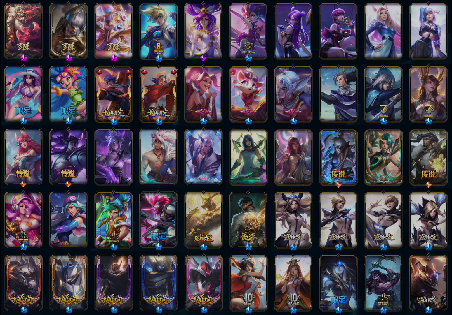 【传说皮肤】黯黑魔龙希瓦娜 黯晶凤凰艾尼维亚 暗星锤石 暗星女王拉克丝 暗星尊烬 奥德赛凯隐 霸天零式赛恩 霸天异形卡兹克 冰川巨兽墨菲特 冰霜亚龙希瓦娜 冰霜之刃艾瑞莉娅 苍穹之光韦鲁斯 大天使长米迦勒凯尔 电玩女神娑娜 第三类接触黑默丁格 地狱行者孙悟空 地狱之门卫士加里奥 恶魔男爵瑞兹 恶魔之刃泰达米尔 符文战熊沃利贝尔 鬼魂新娘莫甘娜 黑夜使者亚索 合金巨兽努努和威朗普 红色男爵库奇 金牌主播德莱文 枯萎之壤泽拉斯 炼狱魔犬内瑟斯 烈焰雄心崔丝塔娜 黎明使者锐雯 黎明使者索拉卡 灵魂莲华阿狸 灵魂莲华锤石 陆地王者4WD布里茨 律政大亨蒙多 魔幻卡牌崔斯特 女皇艾希 女警狙击凯特琳 女主播迦娜 欧米伽小队幽灵特工 偶像歌手阿狸 苹果机器人布里茨 蔷薇绅士杰斯 丧尸布兰德 神龙尊者圣龙李青 神龙尊者昼日真龙亚索 神拳李青 绅士科加斯 神王德莱厄斯 双重冰晶艾尼维亚 死亡骑士盖伦 天煞劫 铁哥们儿奥拉夫 提莫约德尔人的一大步 屠龙勇士潘森 未来战士凯特琳 西部魔影卢锡安 西部天使艾希 西部天使赛娜 邪鸦魅影乐芙兰 腥红之月鬼武姬阿卡丽 星之守护者霞 驯龙炮手崔丝塔娜 驯龙学者黑默丁格 焰尾妖狐阿狸 耀星女神拉克丝 泳池派对吉格斯 源计划超体莫德凯撒 源计划毁灭派克 源计划净化薇恩 源计划林易 源计划泯灭雷克顿 约德尔国队长提莫 月蚀骑士蕾欧娜 宇航员诺提勒斯 战场女武神凯尔 战斗学院凯特琳 真实伤害艾克 最终BOSS维迦