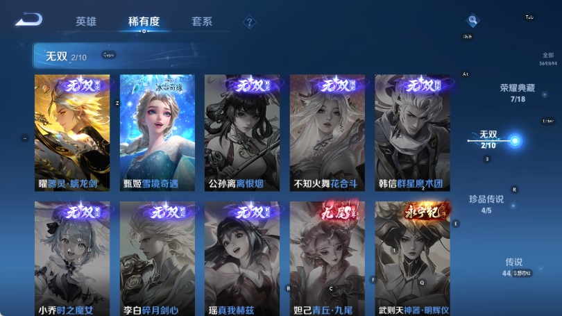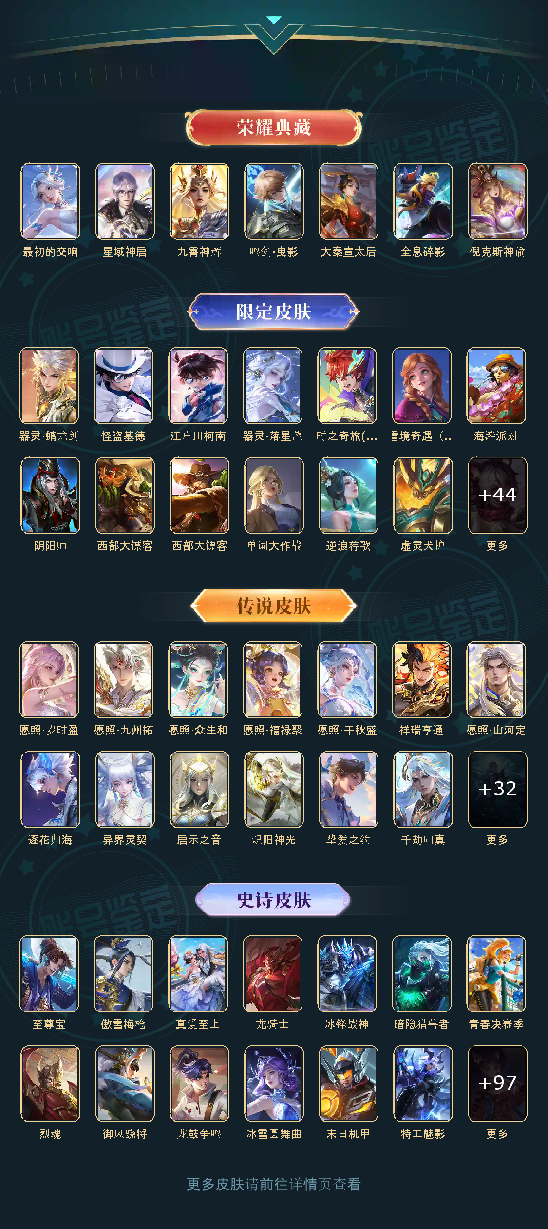 贵族等级V10,英雄数量124,典藏皮肤数7,皮肤数量369,大秦宣太后/全息碎影/倪克斯神谕/鸣剑·曳影/星域神启