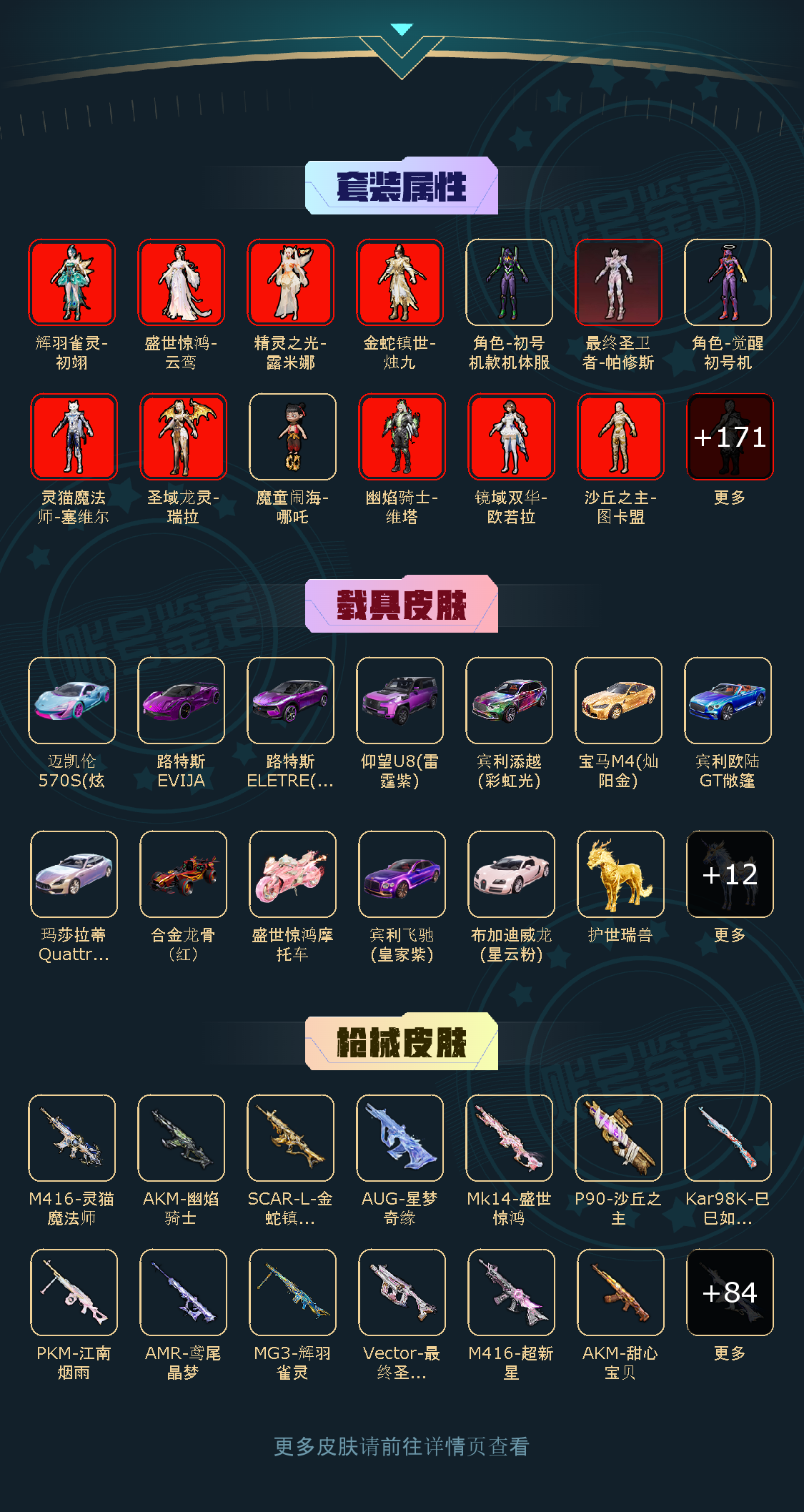 174粉,23载具,640套装,26王牌印记 DP-28-暗夜鎏金/M417-第五大道/AWM-平天焚空/UZI-绮梦青鸾/AKM-盖世英雄/UZI-畅跳缤纷/AKM-甜心宝贝/SCAR-L-梦幻火箭/AUG-星梦奇缘/Kar98K-伏魔团/爆炸猎弓-雪梅暗香/烟雾弹-丁香清露/M249-彩虹甜喵/P90-仙履奇缘/SCAR-L-甜梦小狐/平底锅-仲夏莫吉托/P90-电糖天使/Kar98K-圣域龙灵/AWM-花间之火/M762-电糖天使/Famas-翎光蝶翼/GROZA-旋转彩虹/汤姆逊-怪笑疯兔/PKM-天星战神/Mk14-盛世惊鸿/Vector-红伞翩翩/UZI-圣斗士星矢/汤姆逊-星月云朵/AMR-鸢尾晶梦/P90-甜蜜草莓/AUG-甜心首席/Kar98K-巳巳如意/MG3-酷泡奶龙/GROZA-巴啦啦小魔仙/GROZA-香水柠檬/Mk14-精灵梦叶罗丽/P90-能量风暴/M416-暖熊萌萌/AKM-幽焰骑士/SPAS-12-蜜语绒猫/SCAR-L-天蓬元帅/UMP45-宇宙意志/M416-心之恋语/SCAR-L-纯梦嫁纱/Mk14-闲梦青缨/GROZA-超新星/M24-镜域双华/MG-36-幻梦之森/平底锅-林间仙鹿/M416-女娲灵识/AMR-炫光之旅/AKM-魔法神域/AKS-74U-信仰神谕/DP-28-幻梦音符/M16A4-垂柳戏鸭/M249-猪猪侠/AKM-炫紫旋律/M200-玉鳞金羽/DP-28-金蝉行者/GROZA-精灵之光/Kar98K-未来歌姬/DP-28-圣堂之誓/Mk14-樱桃泡泡/MG3-洛神天依/M416-墨龙九天/GROZA-焦糖拿铁/GROZA-玉面桃花/AKM-百合蜜语/SVD-月影灵韵/M200-梦海之灵/M416-至情至圣/SCAR-L-时空协奏/SCAR-L-金蛇镇世/PKM-江南烟雨/SLR-暗夜玫瑰/S12K-海渊国主/AKM-星际浪客/AUG-妙趣可丽/UMP45-雪国精灵/M762-甜蜜誓约/AUG-超新星/烟雾弹-猫咪绅士/DP-28-千金淑猫/M416-超新星/M24-星之信仰/UMP45-恐龙拽拽/Mini14-龙虾霸霸/M249-蓝莓炮弹/P90-沙丘之主/蜜獾-辉耀战甲/破片手榴弹-粉粉猫爪/M24-莲影清波/UMP45-玉魂晶魄/迈凯伦570S(炫冰蓝)/疾风龙骑/护世瑞兽/路特斯EVIJA(电光紫)/双人摩托-梦幻火箭/兰博基尼URUS(尊享铂)/布加迪威龙(星云粉)/星梦玉骢/宾利飞驰(皇家紫)/宾利欧陆GT敞篷(深空蓝)/路特斯ELETRE(电光紫)/宝马M4(灿阳金)/仰望U8(雷霆紫)/关羽赤兔马/赵云玉狮子马/星河领航(炫晶粉)/天马凌跃(闪耀金)/宾利添越(彩虹光)/玛莎拉蒂Quattroporte幻星粉/鬼马风驰/晶梦灵驹/合金龙骨(红)/盛世惊鸿摩托车/