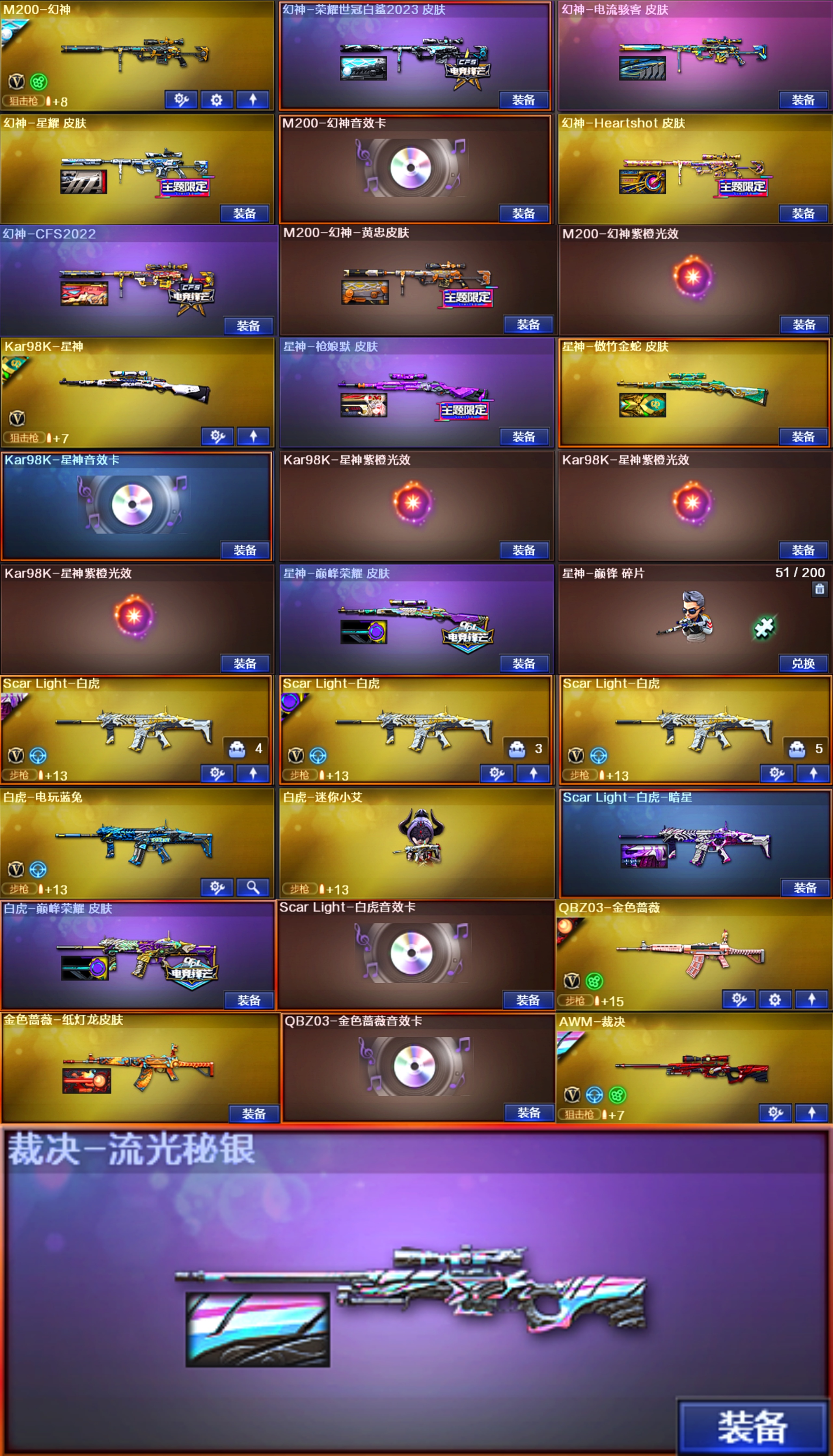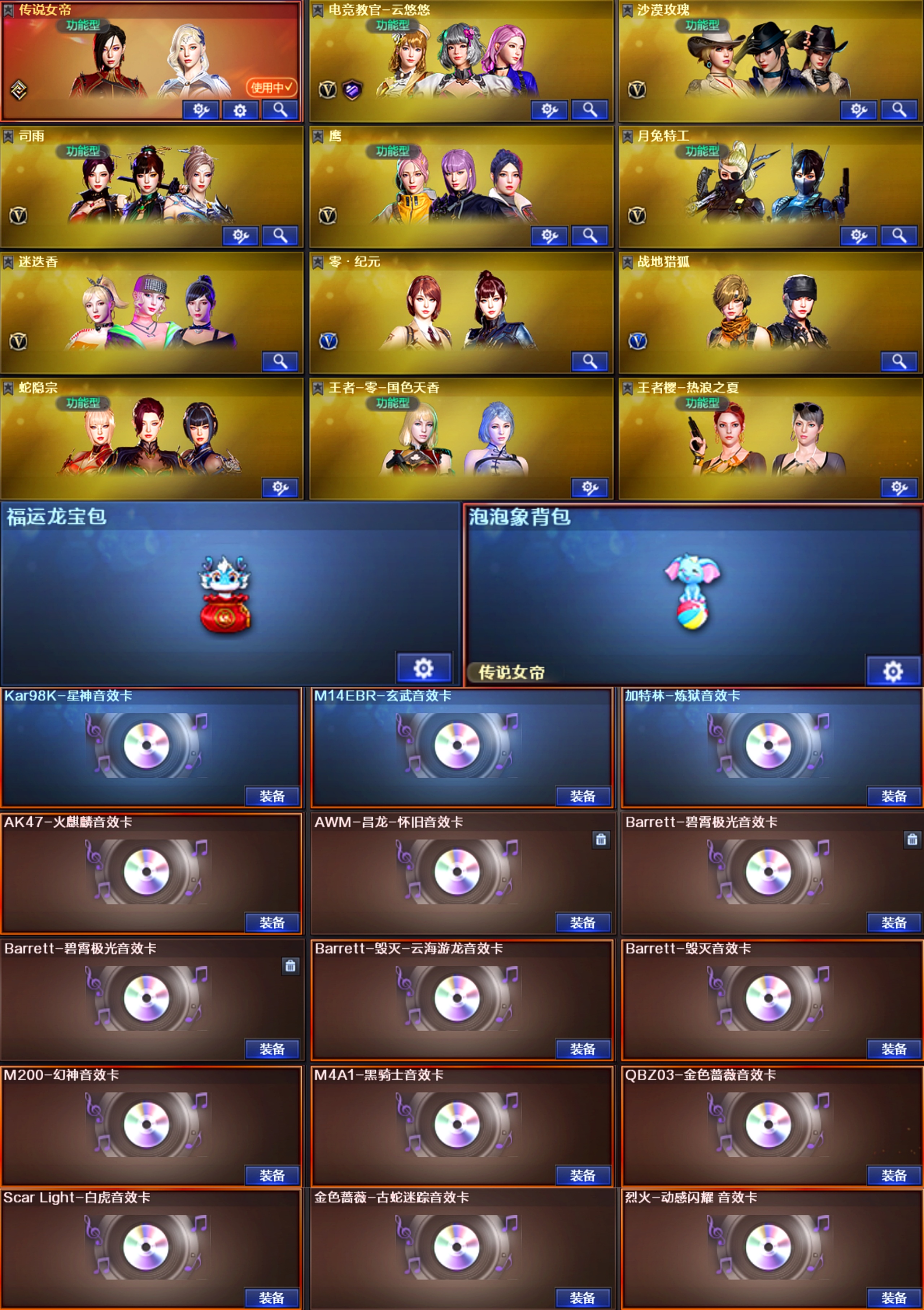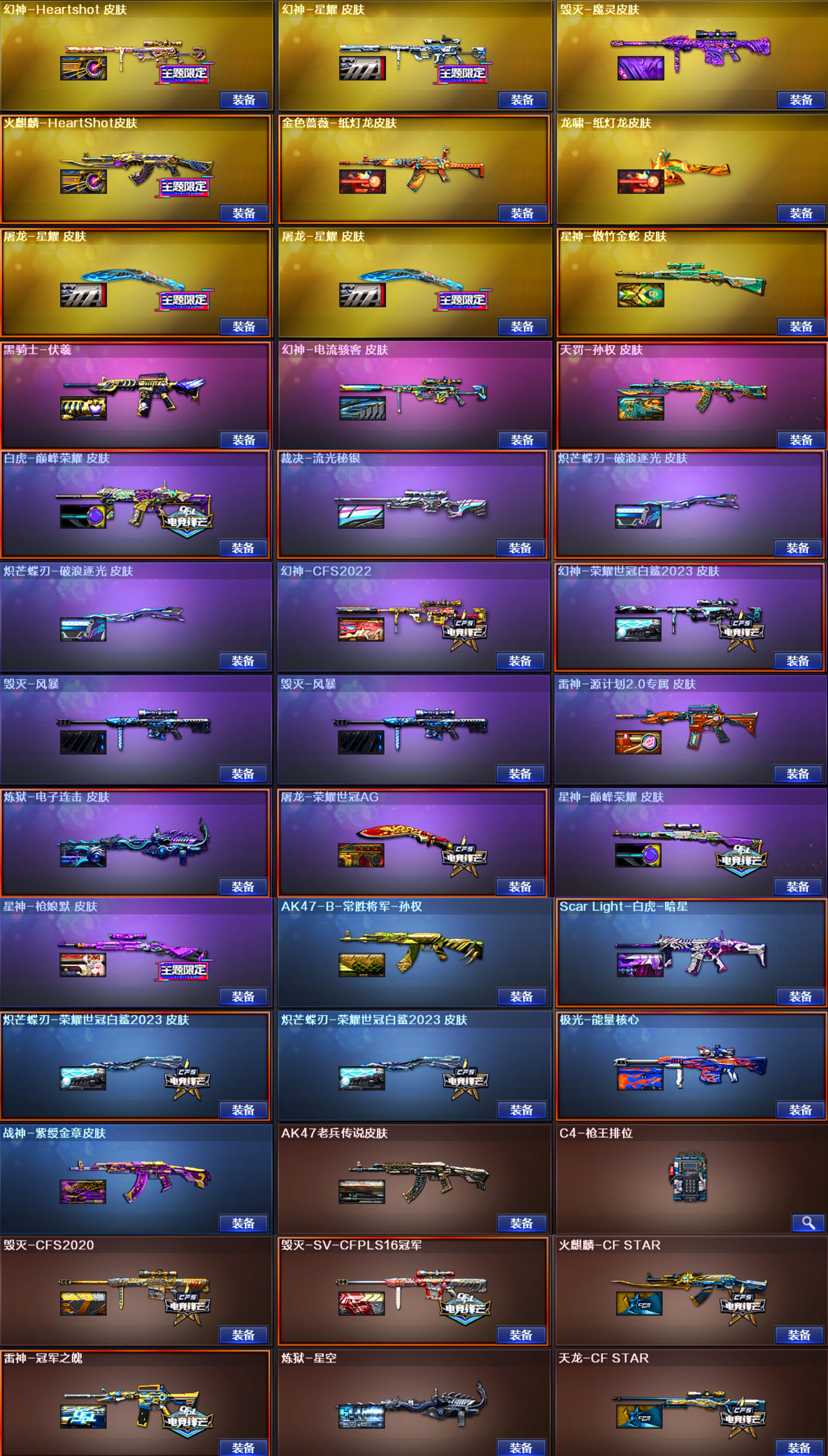 【幻神三件套】【幻神6皮】【星神三件套】【白虎三件套】【金色蔷薇三件套】【6烈龙】【毒蜂】【斯泰尔-枪娘暗刃】【异变清道夫】【萌兔-斯泰尔】【斯泰尔-蝴蝶】【6盘龙】【炼狱-迷你小钢】【堕天神套装X7套】【堕天神套装X7套】【幻灵套装X1套】【竞技荣光套装X4套】【传说女帝】【传说幽瞳】【传说灵眸】【传说圣灵】【传说梦魇】【传说光耀】【传说暗裔】【传说辉光】【传说幽冥】【神秘礼盒背包】【M200-幻神】【幻神-荣耀世冠白鲨2023 皮肤】【幻神-Heartshot 皮肤】【幻神-星耀 皮肤】【幻神-CFS2022】【幻神-电流骇客 皮肤】【M200-幻神-黄忠皮肤】【M200-幻神音效卡】【M200-竞技荣光】【Kar98K-星神】【星神-傲竹金蛇 皮肤】【星神-巅峰荣耀 皮肤】【星神-枪娘默 皮肤】【Kar98K-星神音效卡】【AWM-裁决】【裁决-流光秘银】【Scar Light-白虎】【白虎-巅峰荣耀 皮肤】【Scar Light-白虎-暗星】【Scar Light-白虎音效卡】【白虎-电玩蓝兔】【QBZ03-金色蔷薇】【金色蔷薇-纸灯龙皮肤】【QBZ03-金色蔷薇音效卡】【QBZ03-天罚】【八面凌龙】【G36C-幻影】【HK417-朱雀】【M14EBR-玄武】【M4A1-堕天神】【柯尔特-荣耀世冠白鲨2023】【柯尔特-冠军之特】【柯尔特-无冕之王】【荣耀世冠-柯尔特】【柯尔特-竞技荣光】【COP 357-幻灵】【COP-堕天神】【COP 357-雷霆王者-觉醒版】【炽芒蝶刃】【炽芒蝶刃-荣耀世冠白鲨2023 皮肤】【炽芒蝶刃-破浪逐光 皮肤】【Knife-冠军之刃】【黄金猫猫手套-白鲨】【炼狱-迷你小钢】【加特林-炼狱】【RPK-盘龙】【炼狱-风暴】【汤姆逊-烈龙】【烈龙-云海游龙】【斯泰尔-蝴蝶】【斯泰尔-枪娘暗刃】【萌兔-斯泰尔】【毒刺-金线】【毒蜂】【异变清道夫】【USP-铃狮送福】【泡泡象COP357】【USP-嘉年华柯基】【萌兔-斯泰尔】【兔宝宝】【传说女帝】【电竞教官-云悠悠】【迷迭香】【奇洋探员】【乔伊教练】【沙漠玫瑰】【蛇隐宗】【司雨】【王者-零-国色天香】【王者樱-热浪之夏】【修道士】【鹰】【月兔特工】【云海玲珑】【M4A1-雷神】【雷神-冠军之魄】【雷神-源计划2.0专属 皮肤】【AK47-火麒麟】【火麒麟-Heartshot皮肤】【火麒麟-CFSTAR】【AK47-火麒麟音效卡】【M4A1-黑骑士】【黑骑士-伏羲】【M4A1-黑骑士音效卡】【Barrett-毁灭】【毁灭-SV-CFPLS16冠军】【毁灭-CFS2020】【毁灭-风暴】【毁灭-魔灵皮肤】【Barrett-毁灭音效卡】