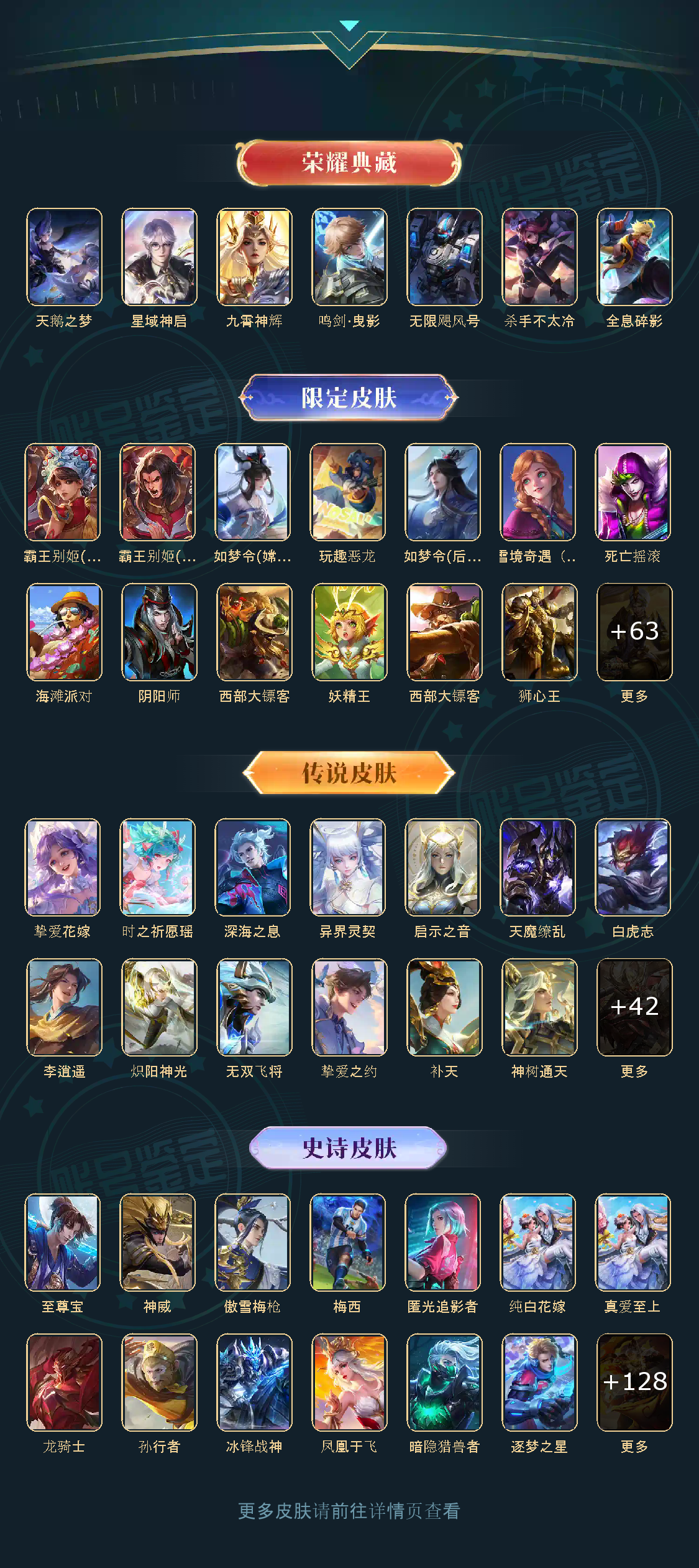 贵族等级V10,英雄数量123,典藏皮肤数7,皮肤数量443,冰锋战神/街头霸王/天鹅之梦/纯白花嫁/天魔缭乱/至尊宝/杀手不太冷/真爱至上/王者之锤/凤求凰/武陵仙君/神奇女侠/梅西/无限飓风号/黄金狮子座/一生所爱/全息碎影/大圣娶亲/冰霜恋舞曲/青龙志/白虎志/朱雀志/太华/久胜战神/飞衡/梁祝/匿光追影者/鸣剑·曳影/星域神启/李逍遥/武圣/奔雷神使/孙行者/玉兔公主/补天/异界灵契/神威/启示之音/傲雪梅枪/淬星耀世/时雨天司