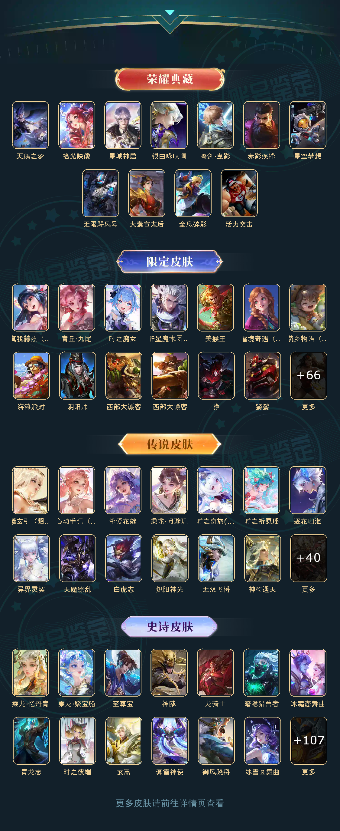 贵族等级V10,英雄数量123,典藏皮肤数11,皮肤数量429,街头霸王/天鹅之梦/天魔缭乱/至尊宝/大秦宣太后/凤求凰/神奇女侠/星空梦想/无限飓风号/黄金狮子座/全息碎影/冰霜恋舞曲/青龙志/白虎志/活力突击/太华/梁祝/鸣剑·曳影/星域神启/武圣/奔雷神使/异界灵契/神威/淬星耀世/时雨天司