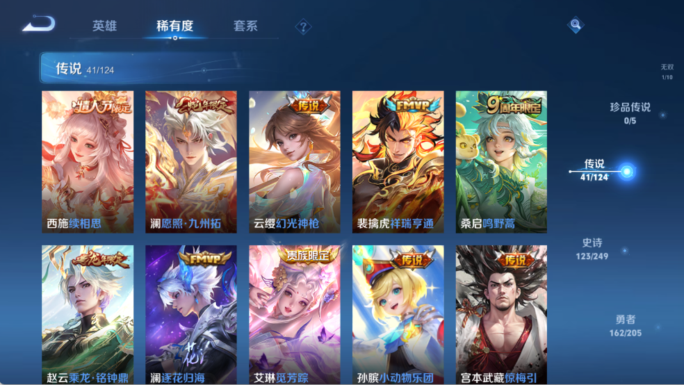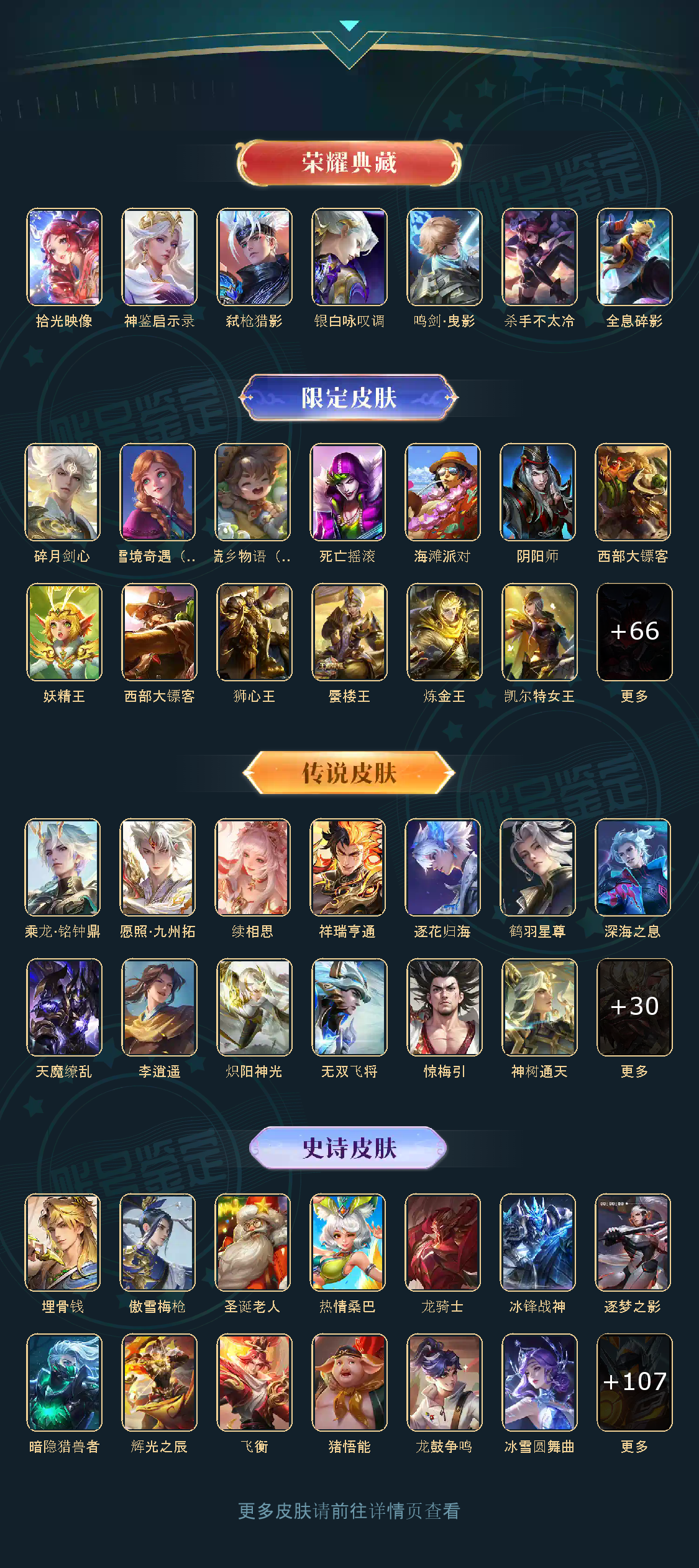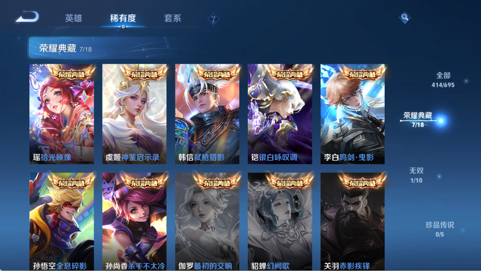贵族等级V10,英雄数量124,典藏皮肤数7,皮肤数量414,