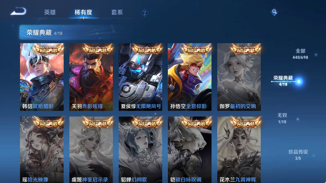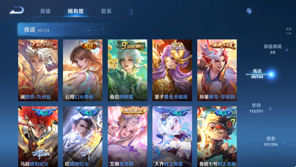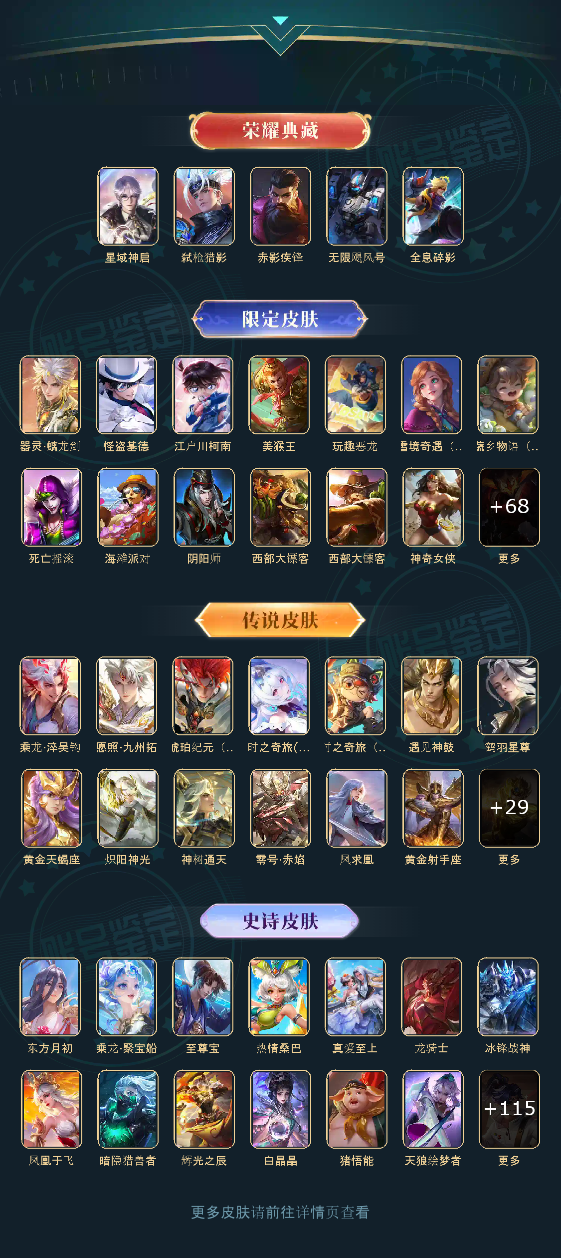 贵族等级V10,英雄数量124,典藏皮肤数4,皮肤数量440,无限飓风号/全息碎影
