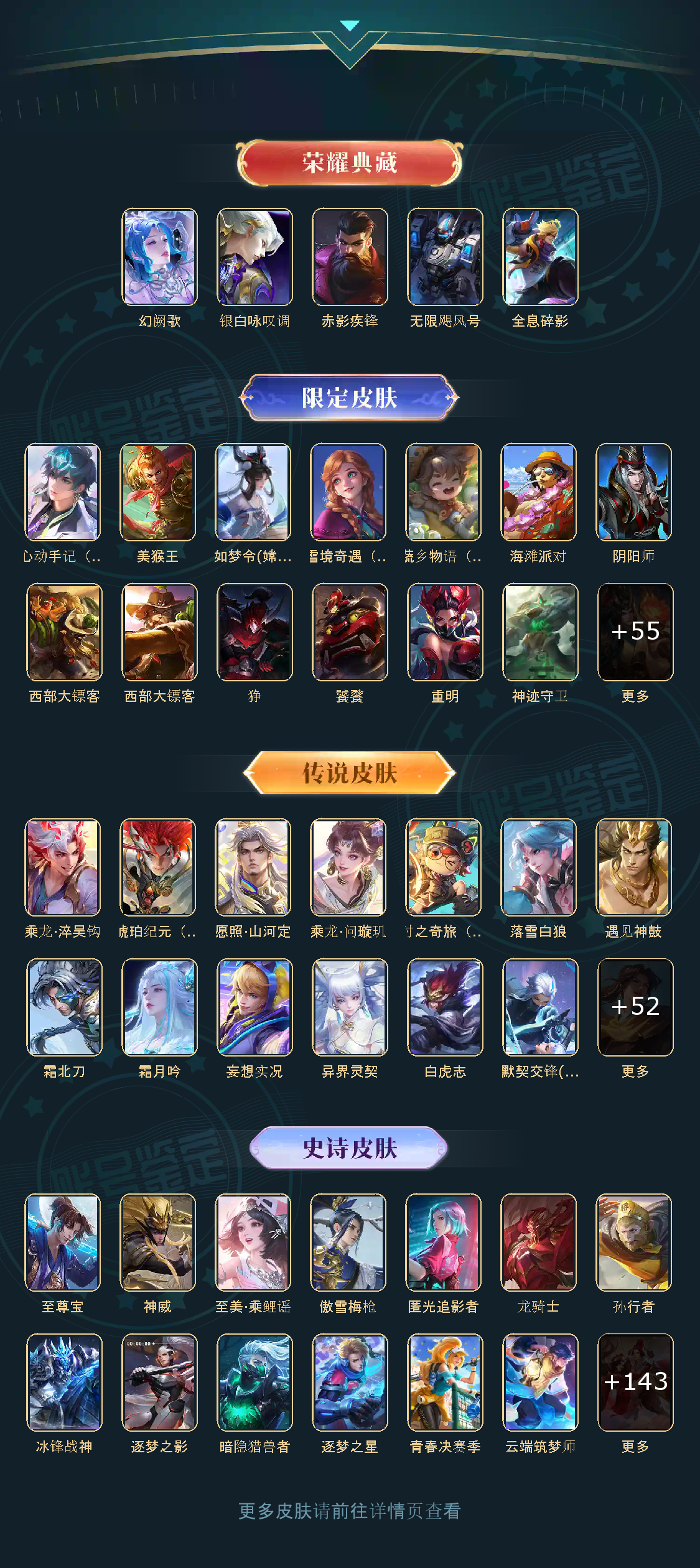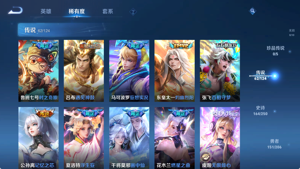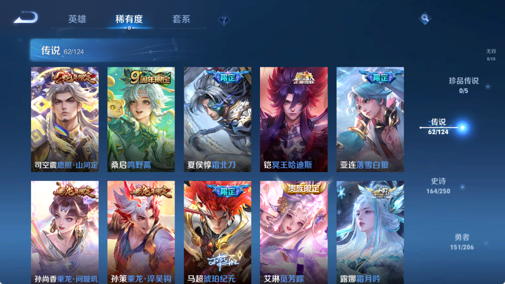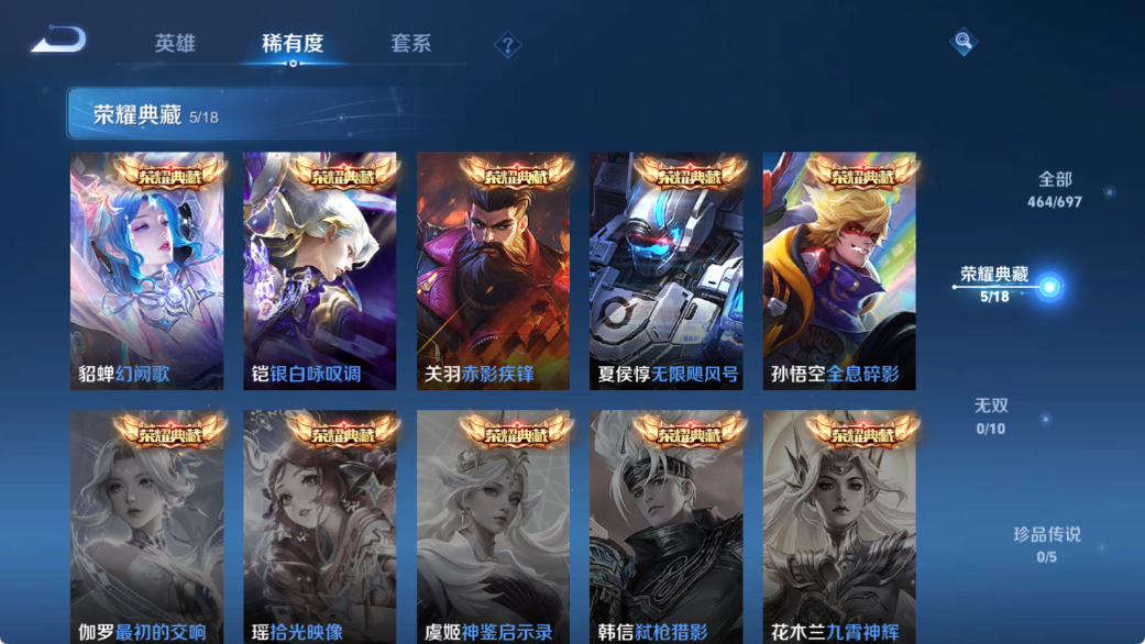 贵族等级V10,英雄数量122,典藏皮肤数5,皮肤数量464,无限飓风号/全息碎影