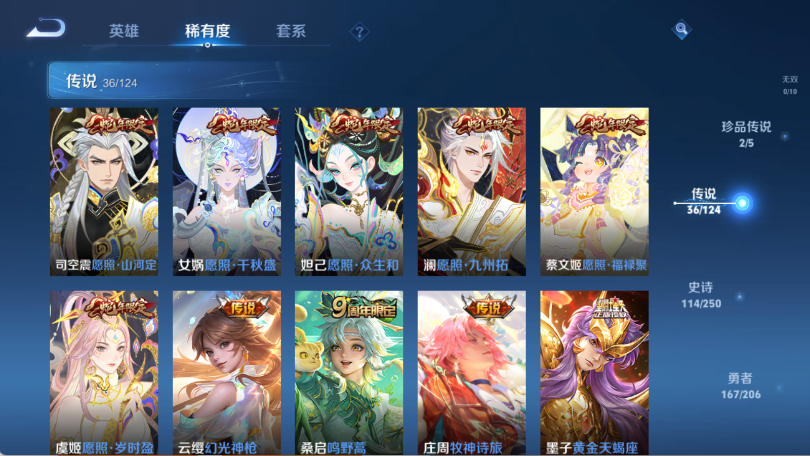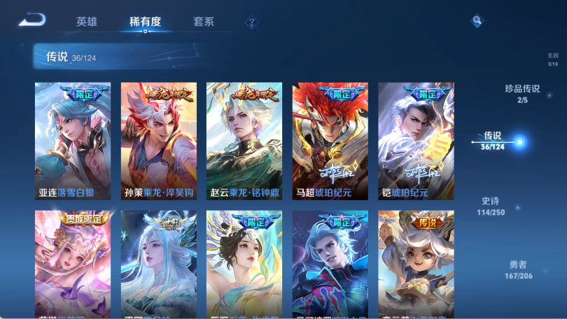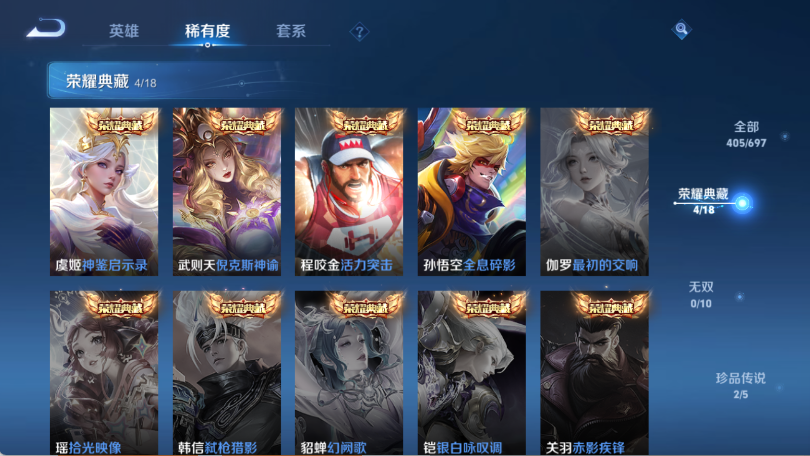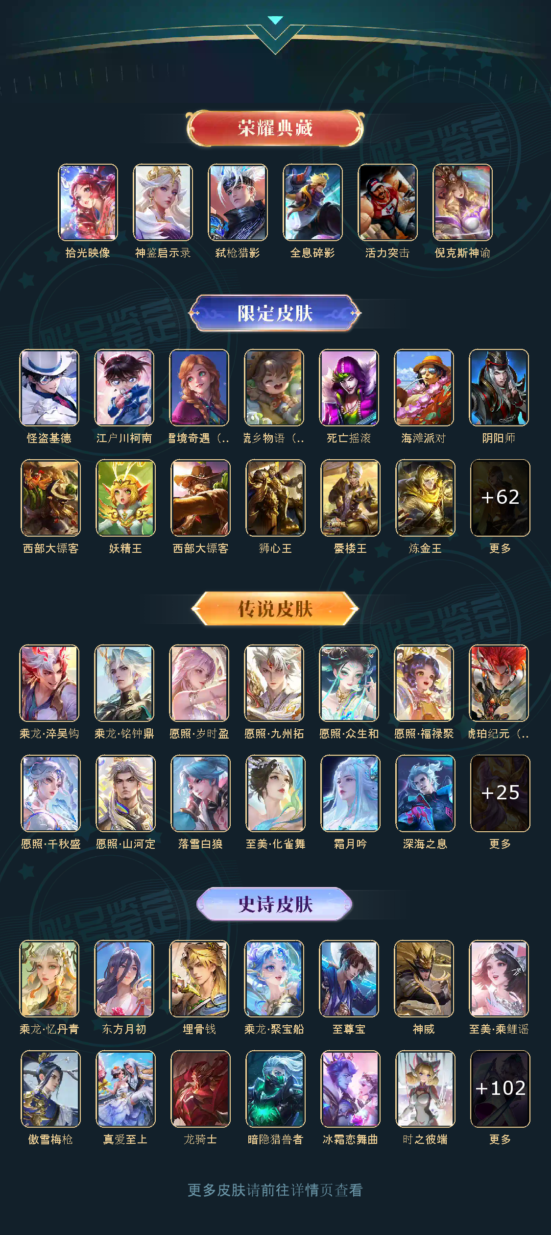 贵族等级V10,英雄数量125,典藏皮肤数4,皮肤数量405,