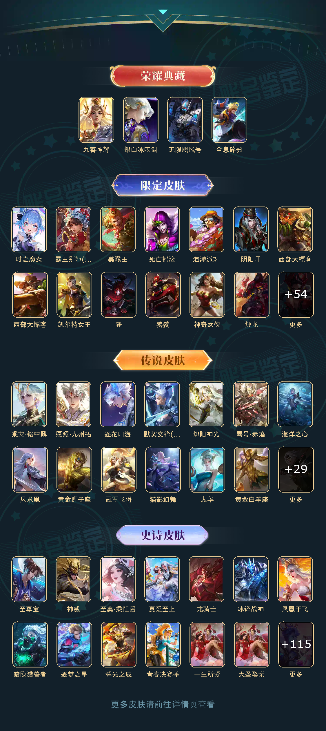 贵族等级V10,英雄数量125,典藏皮肤数4,皮肤数量403,