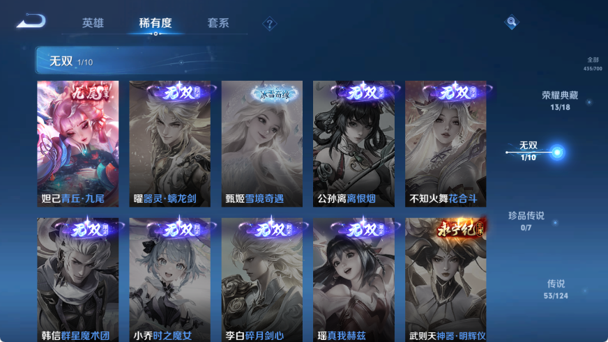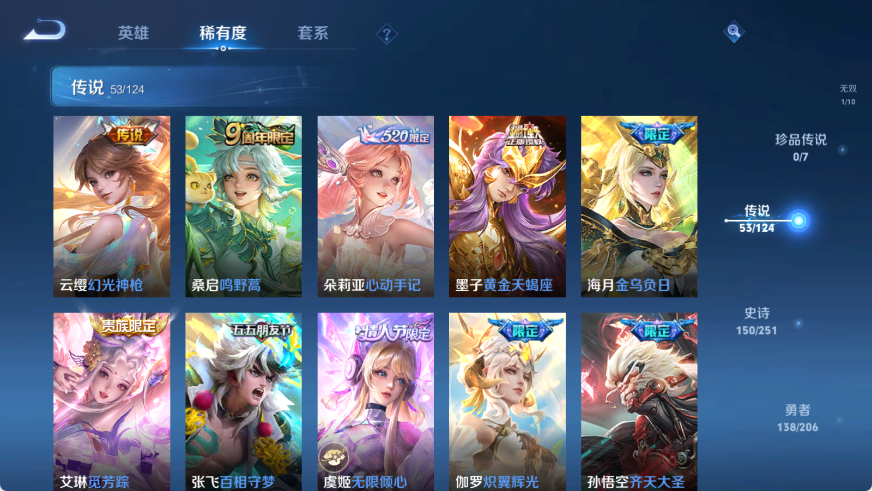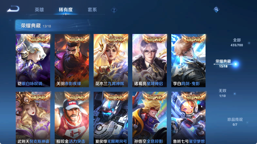贵族等级V10,英雄数量124,典藏皮肤数13,皮肤数量435,星空梦想/无限飓风号/全息碎影/活力突击/倪克斯神谕/鸣剑·曳影/星域神启