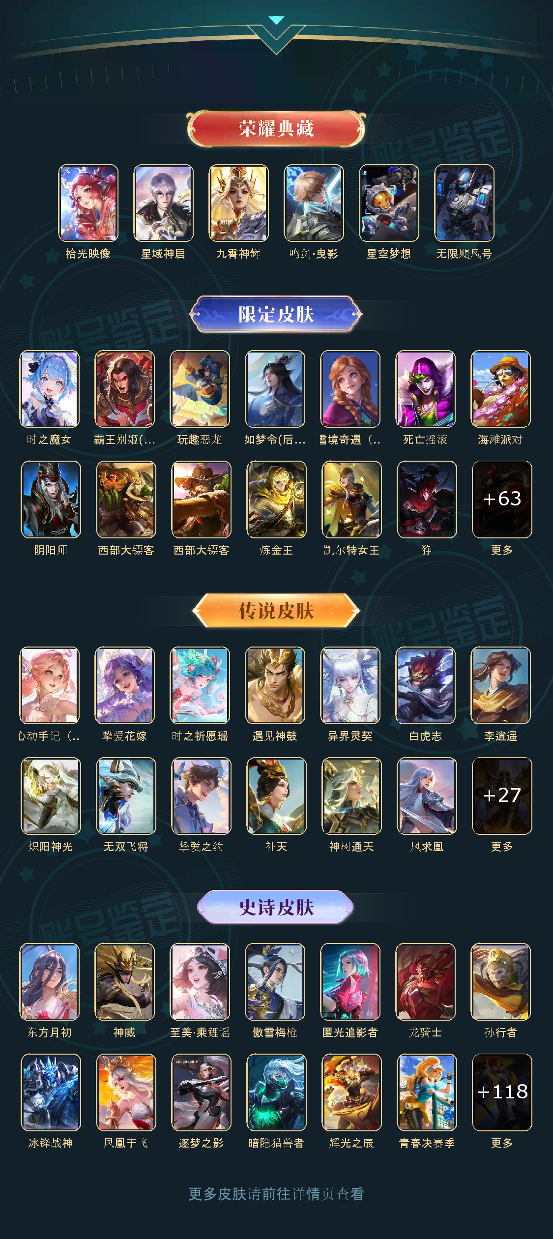 贵族等级V10,英雄数量124,典藏皮肤数4,皮肤数量415,星空梦想/无限飓风号/鸣剑·曳影/星域神启/补天