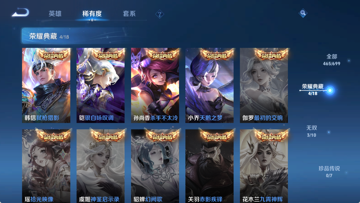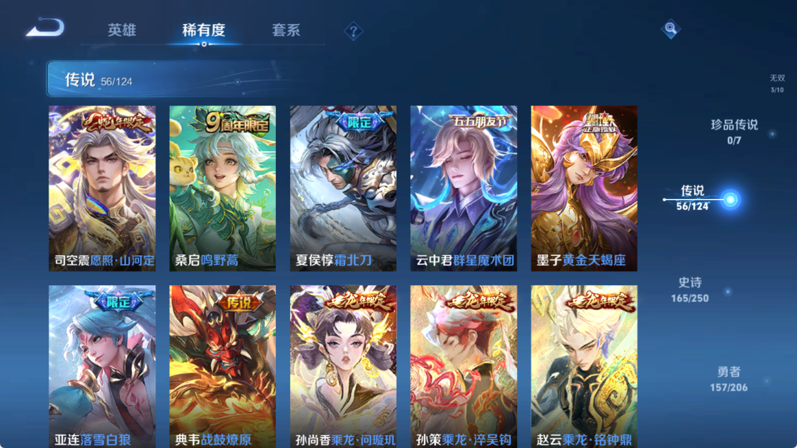 贵族等级V10,英雄数量124,典藏皮肤数4,皮肤数量465,天鹅之梦/杀手不太冷