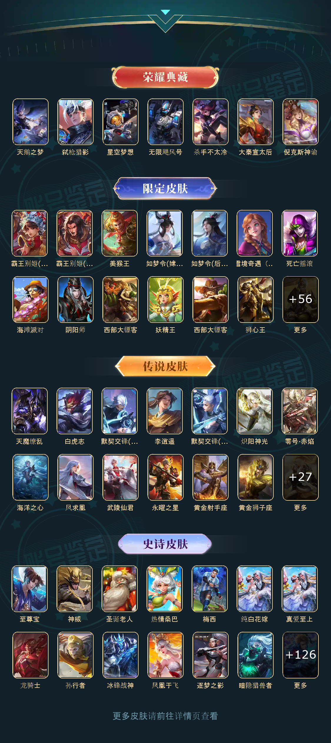 贵族等级V10,英雄数量123,典藏皮肤数6,皮肤数量413,