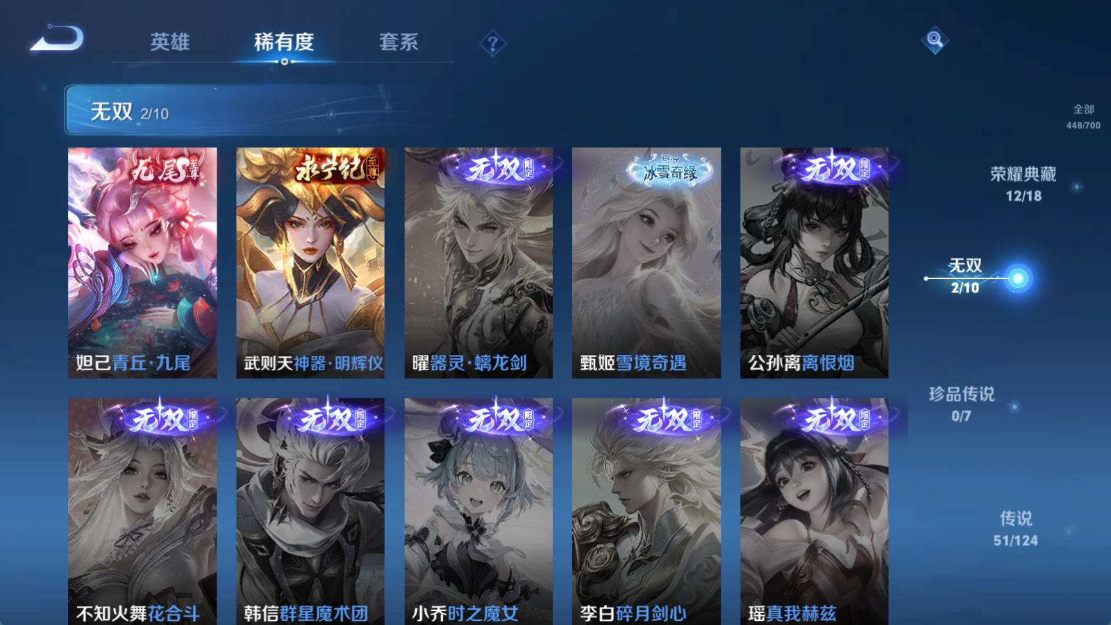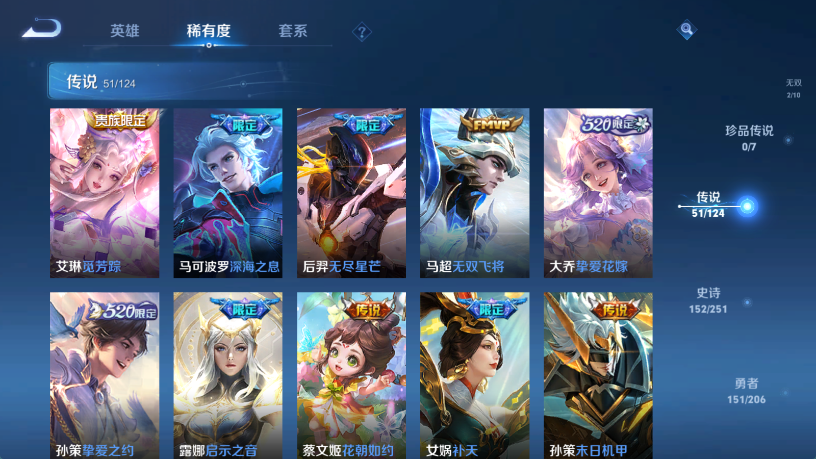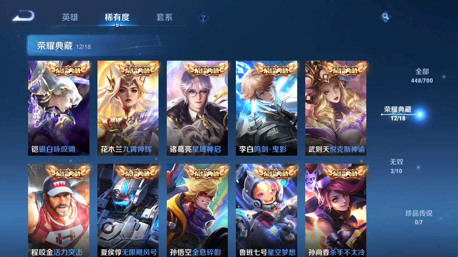 贵族等级V10,英雄数量125,典藏皮肤数12,皮肤数量448,杀手不太冷/星空梦想/无限飓风号/全息碎影/活力突击/倪克斯神谕/鸣剑·曳影/星域神启