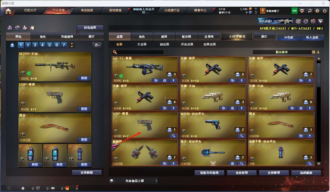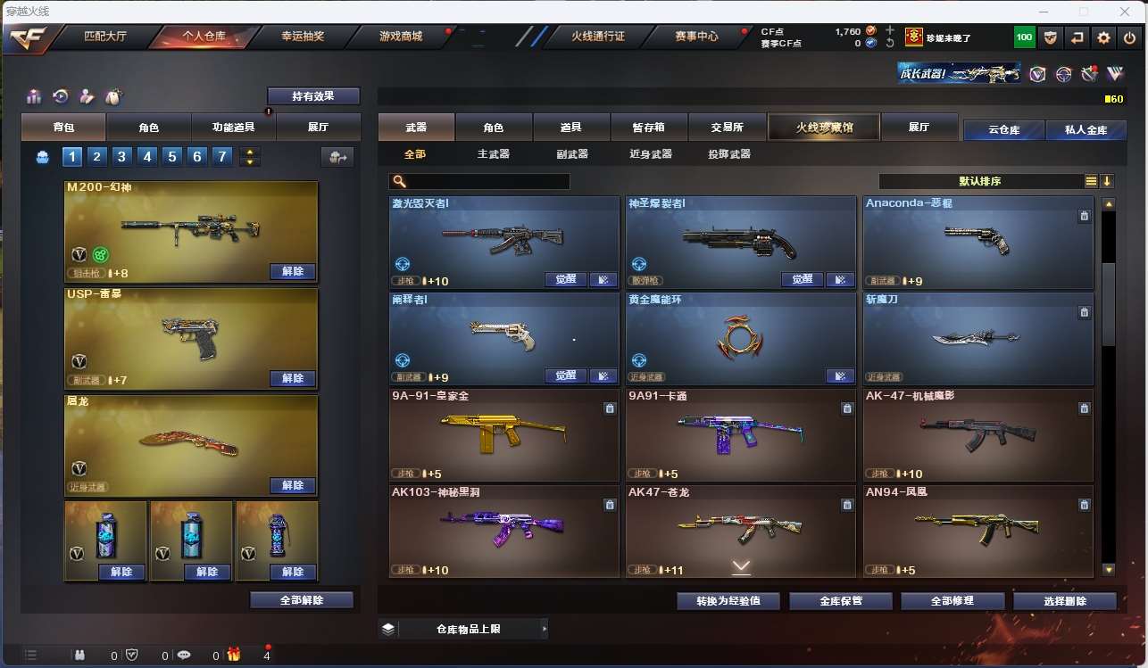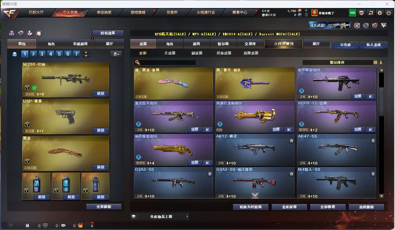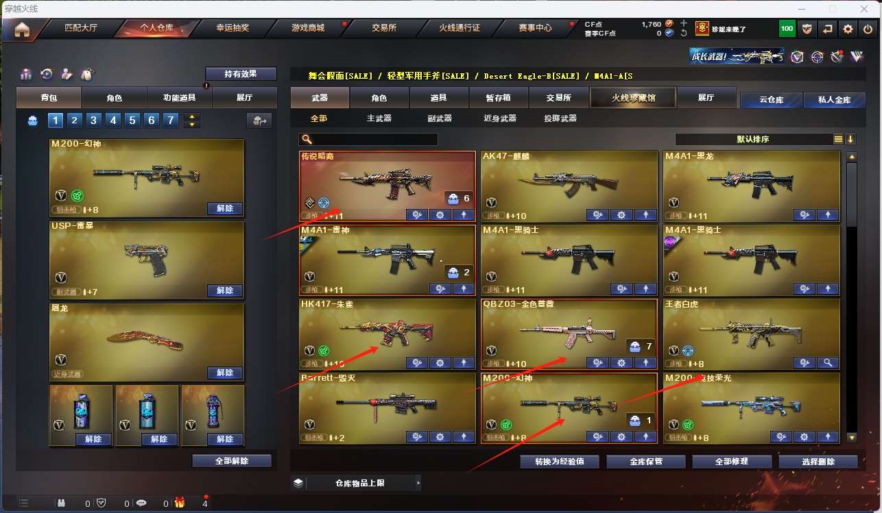 m200幻神】【m200竞技荣光套+usp雷暴+四防云悠悠】【传说暗裔】【王者白虎】【qbz金色蔷薇】【hk417朱雀】【黑龙 】【雷神+荣耀之魄】【黑骑士】【毁灭+卡】 【武器:麒麟】 【7手呛:修罗*3 天神*2 usp雷暴 柯尔特竞技荣光 】 【3刀具:屠龙 麒麟刺 擎天竞技荣光 】 【雷套:竞技荣光雷*4】 【小人呛:】 【音效卡: 毁灭音效卡 白虎音效卡 】 【四防角色:云悠悠 王者葵惊若翩鸿
