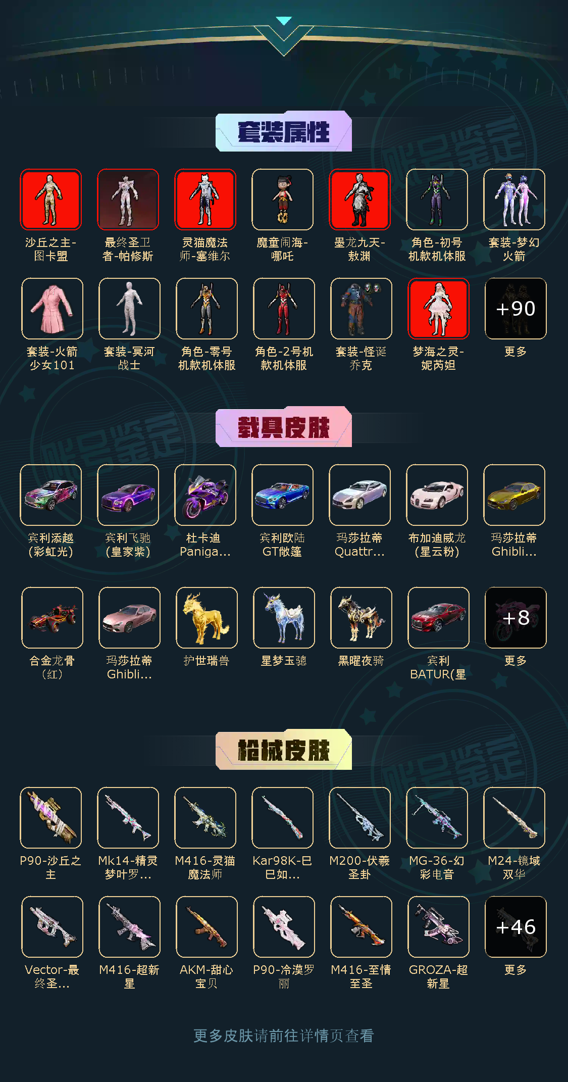 95粉,19载具,54特效枪,502套装,27王牌印记 UZI-绮梦青鸾AKM-甜心宝贝DP-28-扶摇飞仙SCAR-L-梦幻火箭SCAR-L-童趣迷兔Kar98K-伏魔团SKS-碧影闪光M416-风花雪月AUG-星之彼岸AWM-焰龙焚天M762-激战未来GROZA-香水柠檬M416-心之恋语平底锅-林间仙鹿M16A4-葫芦兄弟M416-五爪金龙DP-28-枪炮玫瑰AKM-炫紫旋律MG3-洛神天依S12K-海渊国主M762-甜蜜誓约UMP45-相思残雪M24-星之信仰M249-蓝莓炮弹玛莎拉蒂Ghibli(金)双人摩托-梦幻火箭鬼马风驰合金龙骨(红)玛莎拉蒂Ghibli(粉)快艇-塞莎KL27(鲸之蓝)