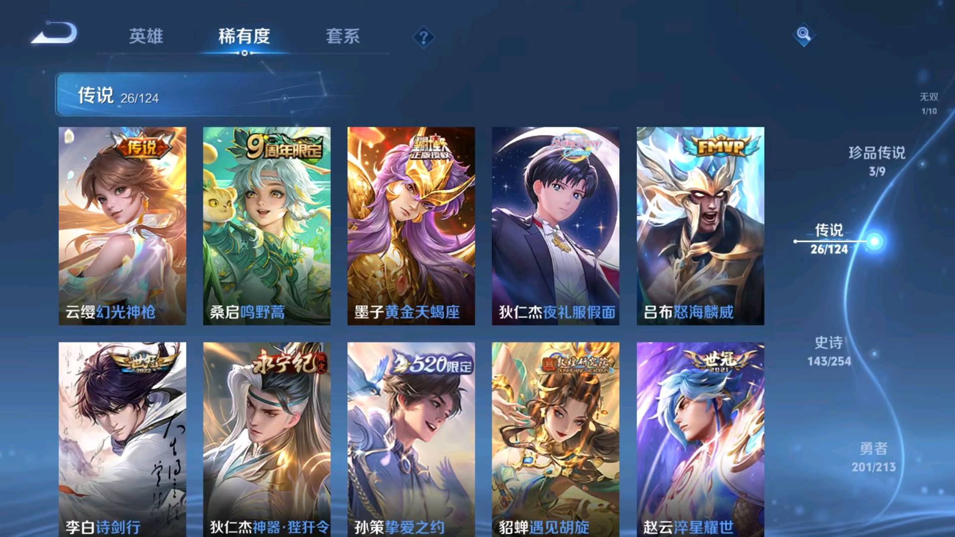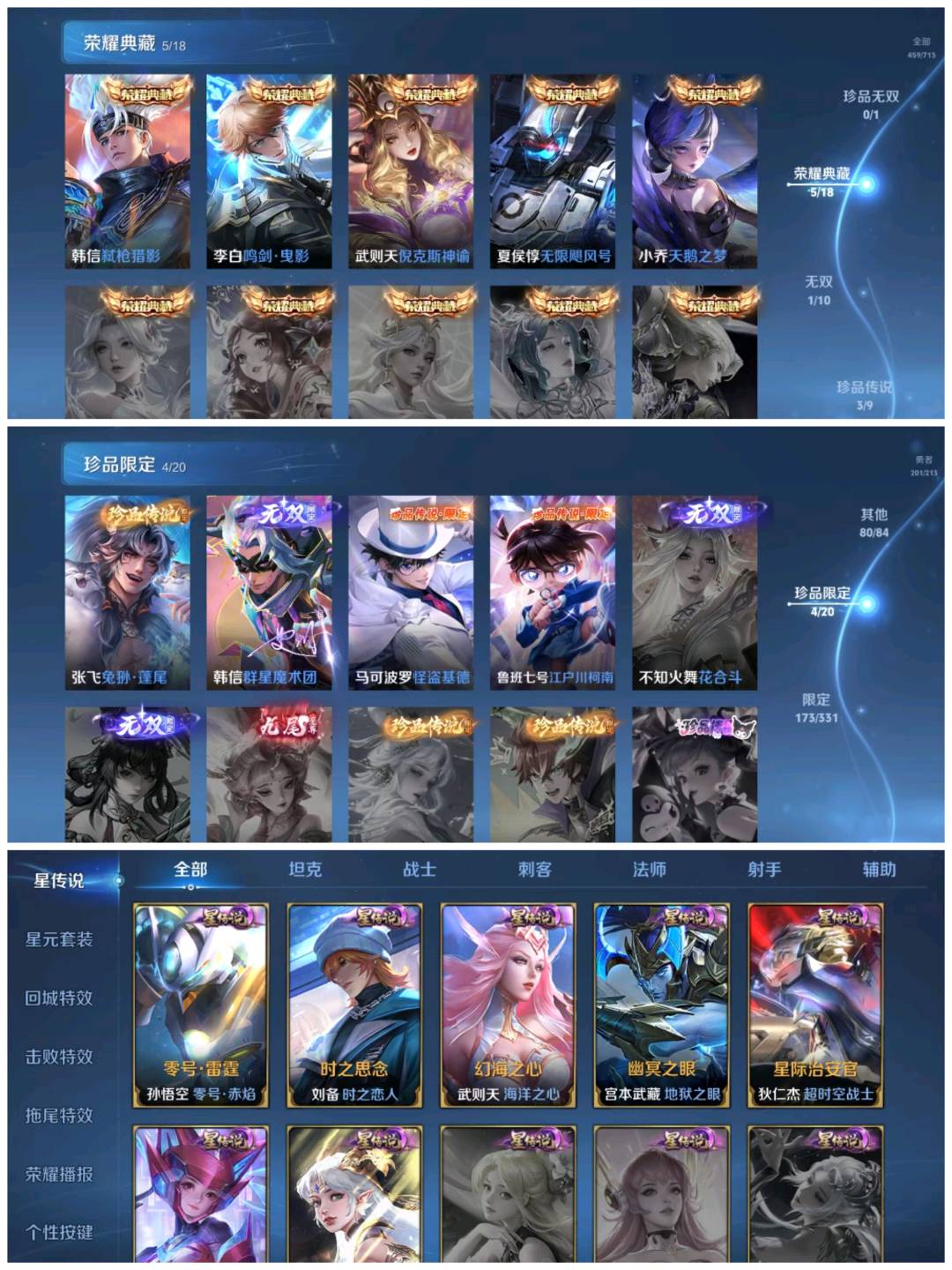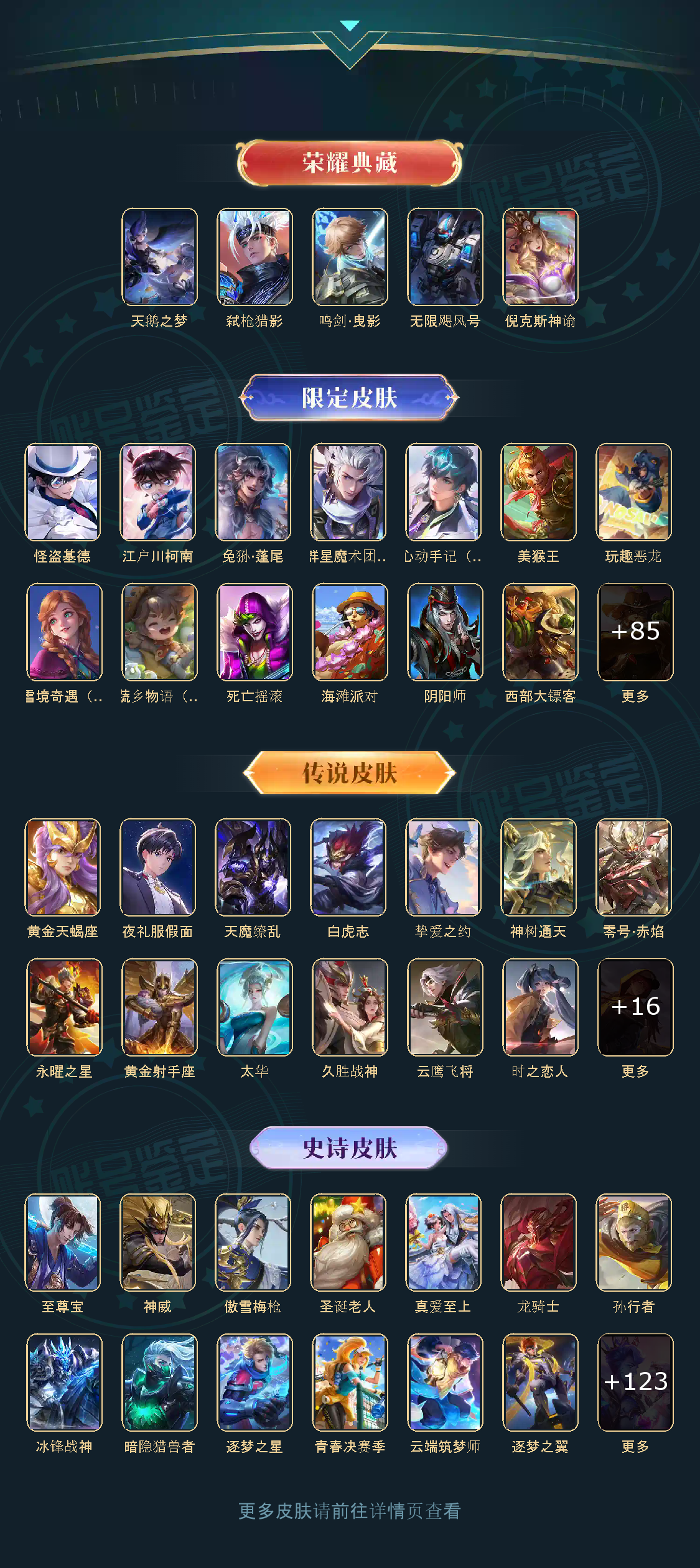 ,英雄数量125,典藏皮肤数5,皮肤数量459,天魔缭乱/至尊宝/真爱至上/圣诞老人/青龙志/白虎志/朱雀志/久胜战神/鸣剑·曳影/群星魔术团(韩信)/武圣/黄金天蝎座/夜礼服假面/兔狲·蓬尾/怪盗基德/弑枪猎影/神威/心动手记(海诺)/江户川柯南/傲雪梅枪/天魔缭乱/至尊宝/真爱至上/圣诞老人/青龙志/白虎志/朱雀志/久胜战神/鸣剑·曳影/群星魔术团(韩信)/武圣/黄金天蝎座/夜礼服假面/兔狲·蓬尾/怪盗基德/弑枪猎影/神威/心动手记(海诺)/江户川柯南/傲雪梅枪