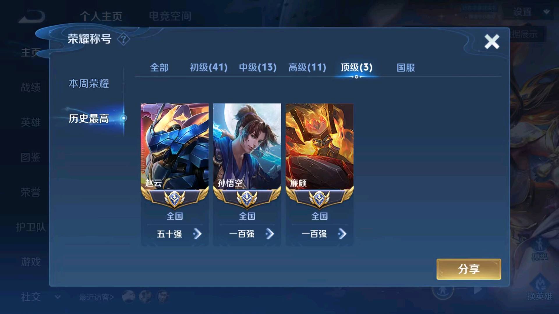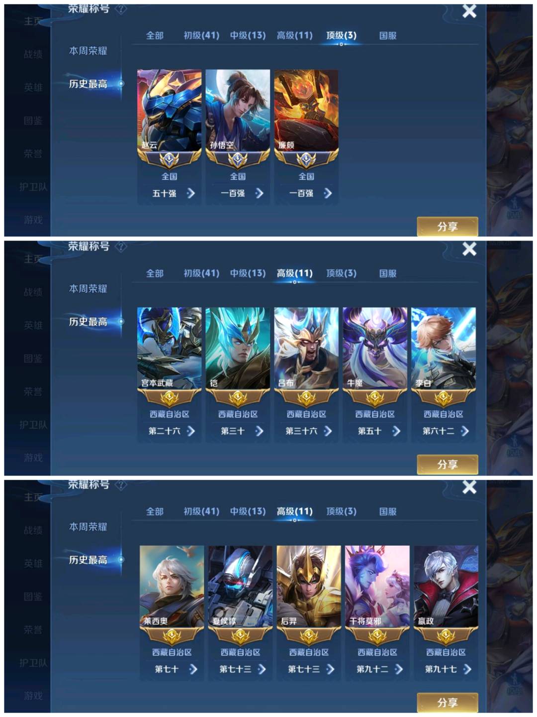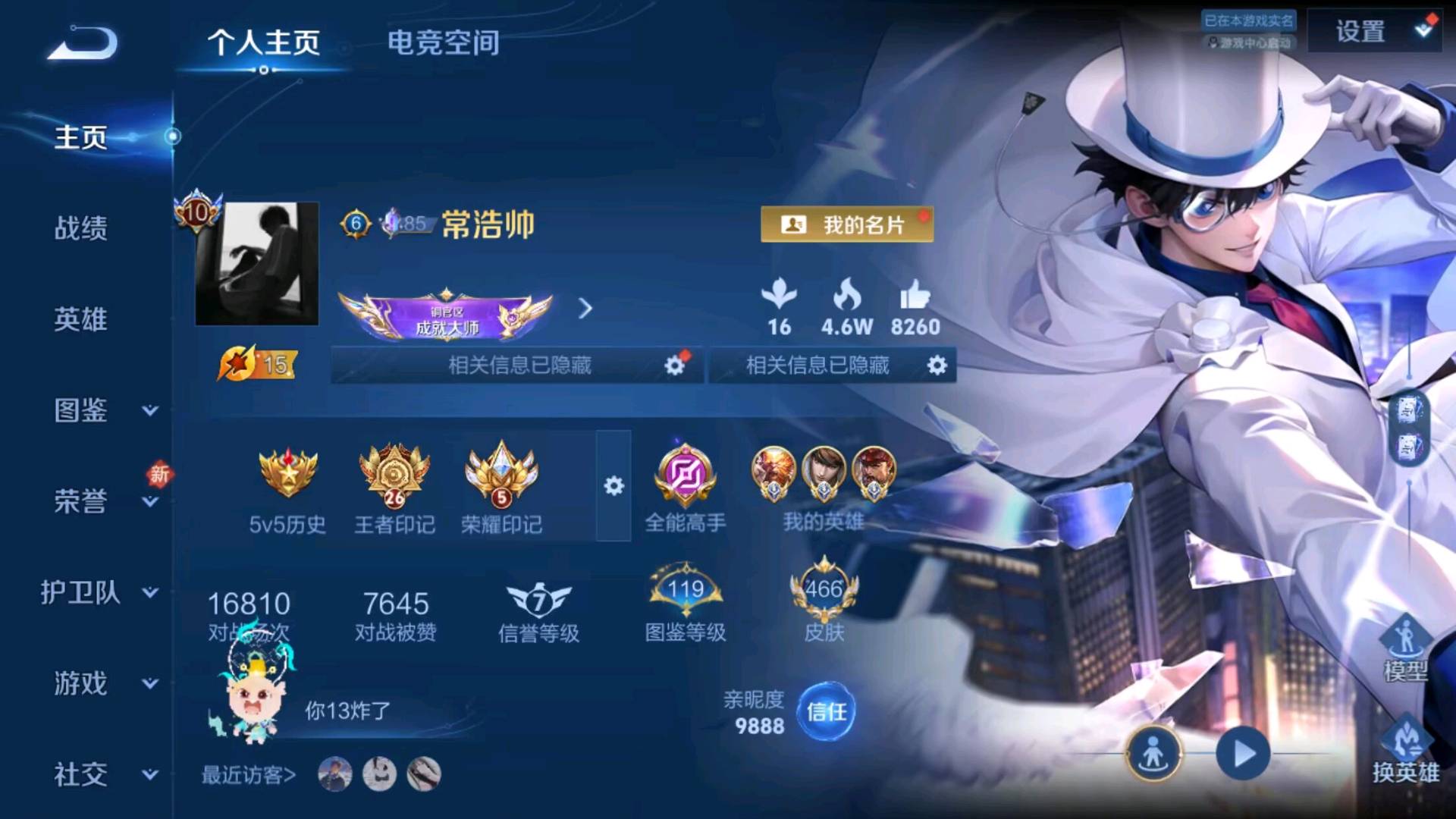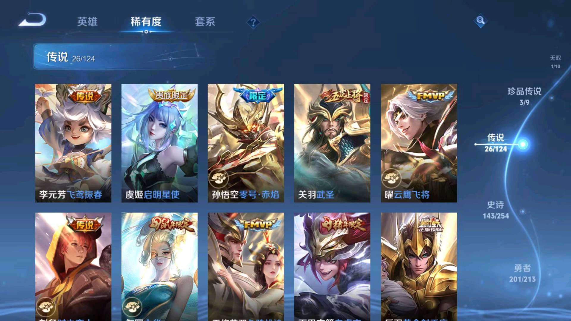 ,英雄数量125,典藏皮肤数5,皮肤数量459,天魔缭乱/至尊宝/真爱至上/圣诞老人/青龙志/白虎志/朱雀志/久胜战神/鸣剑·曳影/群星魔术团(韩信)/武圣/黄金天蝎座/夜礼服假面/兔狲·蓬尾/怪盗基德/弑枪猎影/神威/心动手记(海诺)/江户川柯南/傲雪梅枪/天魔缭乱/至尊宝/真爱至上/圣诞老人/青龙志/白虎志/朱雀志/久胜战神/鸣剑·曳影/群星魔术团(韩信)/武圣/黄金天蝎座/夜礼服假面/兔狲·蓬尾/怪盗基德/弑枪猎影/神威/心动手记(海诺)/江户川柯南/傲雪梅枪