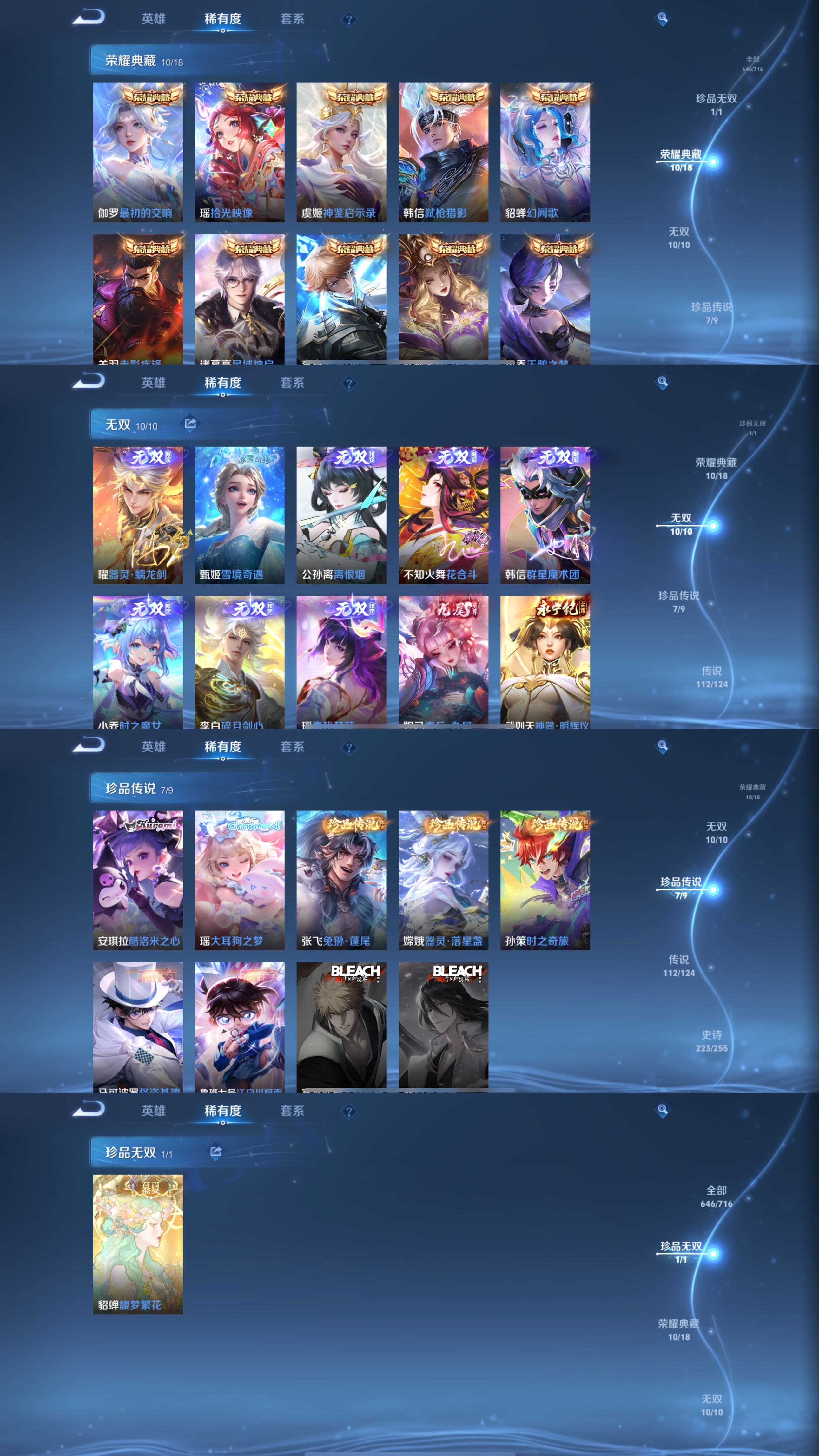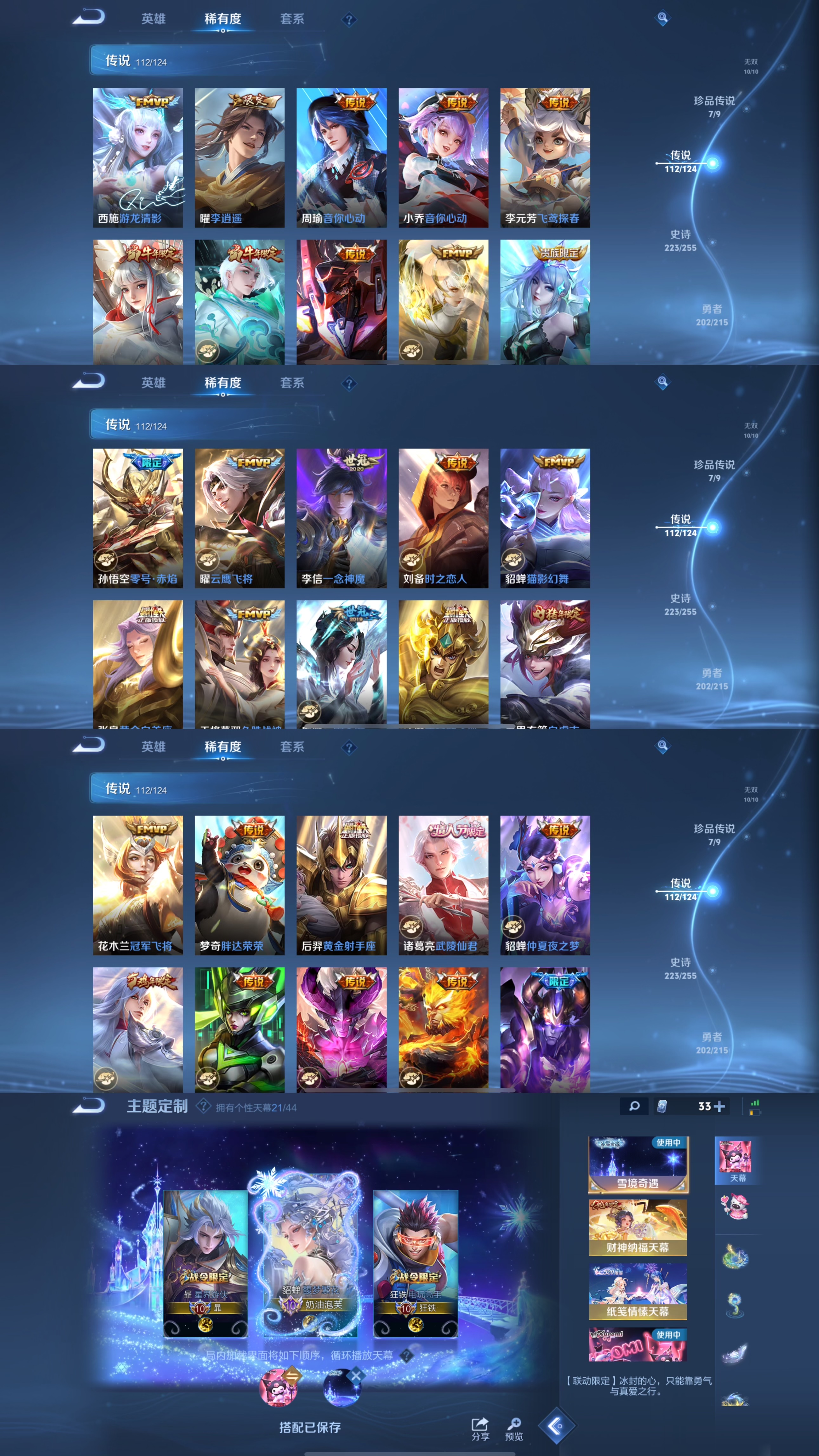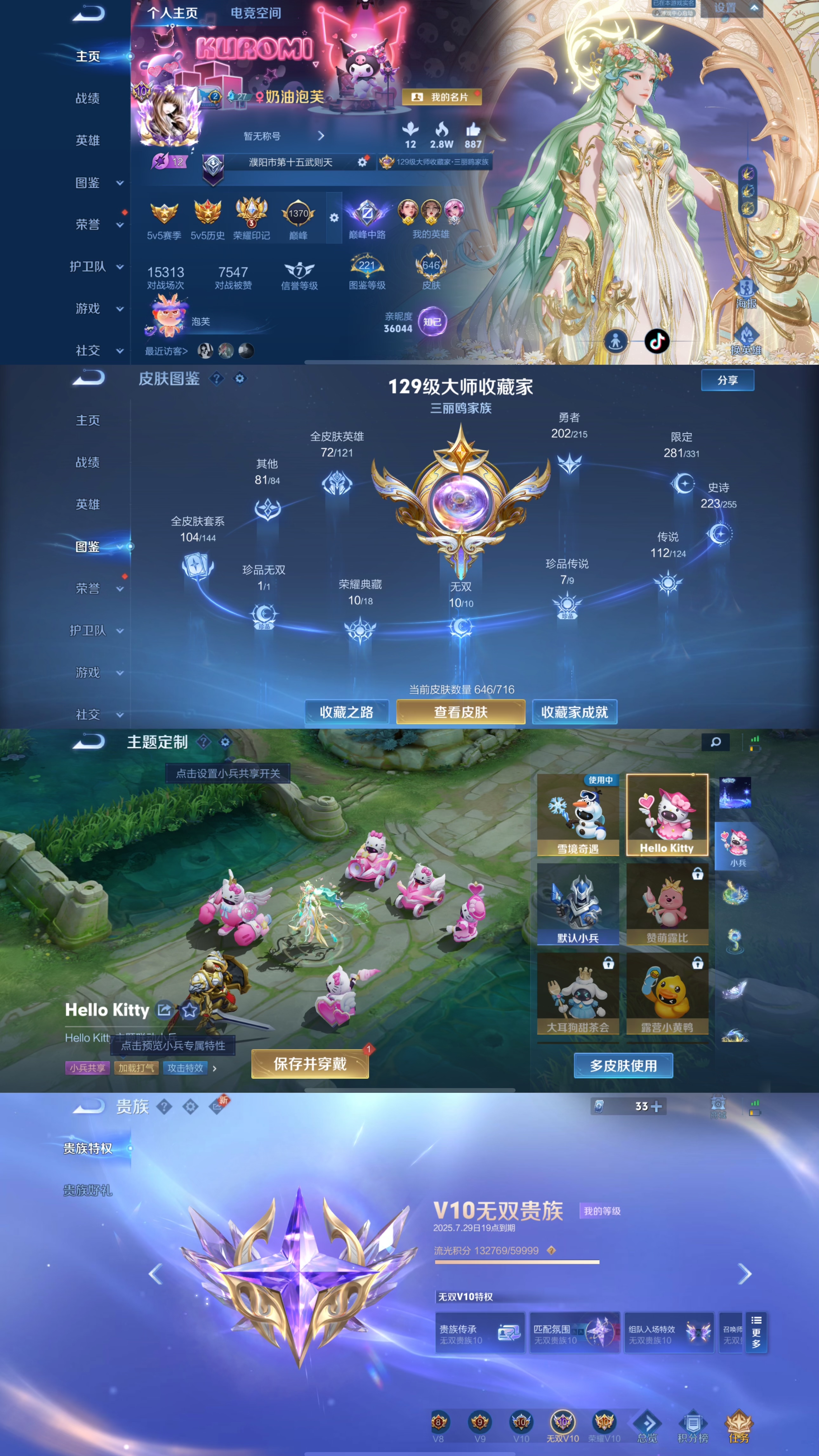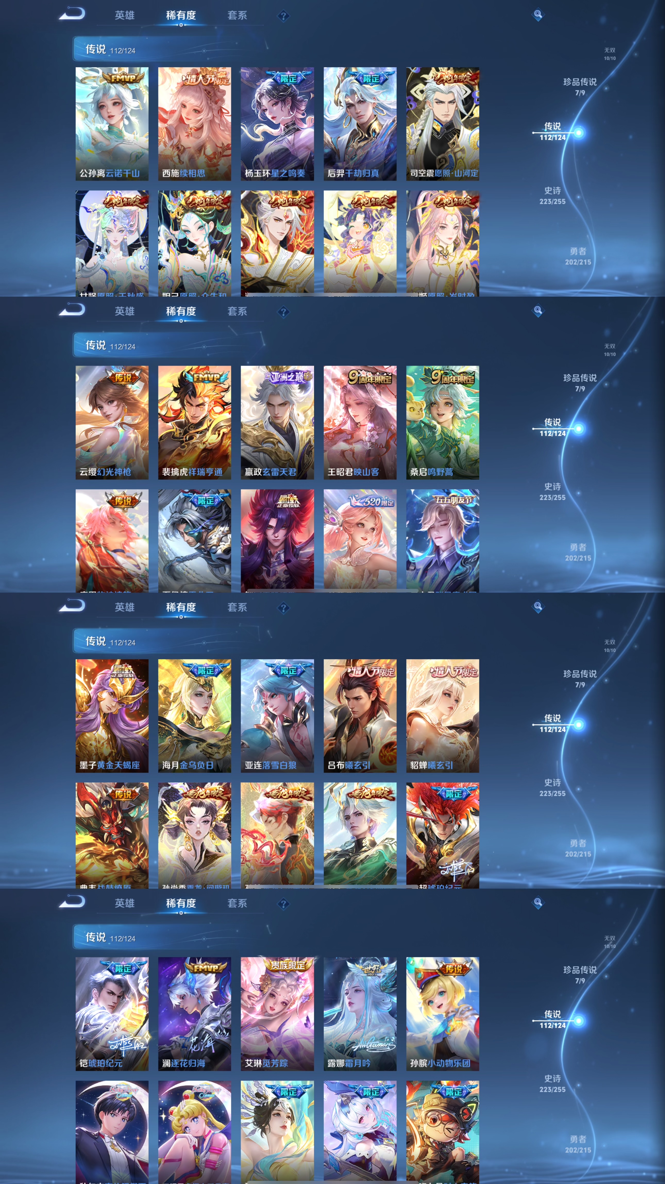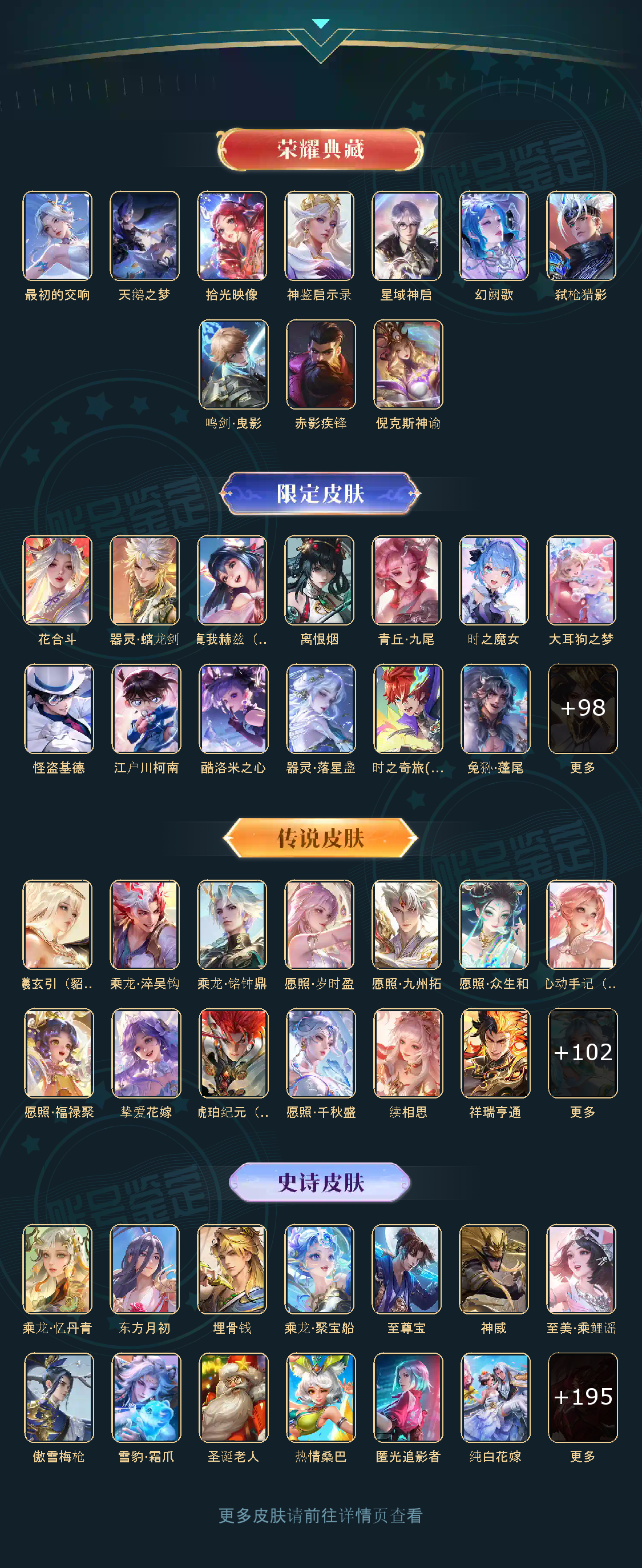 贵族等级V10无双贵族,段位至尊星耀,英雄数量126,典藏皮肤数10,皮肤数量646,纯白花嫁/天魔缭乱/至尊宝/圣诞老人/热情桑巴/青龙志/白虎志/朱雀志/久胜战神/飞衡/器灵·螭龙剑/愿照·九州拓/愿照·众生和/匿光追影者/冥王哈迪斯/神器·明辉仪/鸣剑·曳影/群星魔术团(上官婉儿)/乘龙·问璇玑/群星魔术团(韩信)/神鉴启示录/心动手记(朵莉亚)/时之奇旅(大乔)/赤影疾锋/真我赫兹(瑶)/时之奇旅(鲁班七号)/落雪白狼/愿照·福禄聚/无双飞将/至美·化雀舞/时之祈愿瑶/遇见神鼓/星域神启/李逍遥/群星魔术团(云中君)/花合斗/涂山红红/霜北刀/逐花归海/器灵·落星盏/琥珀纪元(马超)/幻阙歌/至美·乘鲤谣/琥珀纪元(伽罗)/鹤羽星尊/时之奇旅(孙策)/曦玄引(貂蝉)/离恨烟/碎月剑心/愿照·千秋盛/霜月吟/雪境奇遇(甄姬)/乘龙·淬吴钩/东方月初/拾光映像/乘龙·铭钟鼎/大耳狗之梦/埋骨钱/最初的交响/黄金天蝎座/夜礼服假面/兔狲·蓬尾/玉兔公主/补天/怪盗基德/愿照·岁时盈/乘龙·聚宝船/惊梅引/弑枪猎影/续相思/异界灵契/神威/炽阳神光/乘龙·忆丹青/影龙天霄/心动手记(海诺)/青丘·九尾/江户川柯南/云诺千山/鹤归松栖(云缨)/愿照·山河定/酷洛米之心/时之魔女/傲雪梅枪/雪豹·霜爪/馥梦繁花/时雨天司/纯白花嫁/天魔缭乱/至尊宝/圣诞老人/热情桑巴/青龙志/白虎志/朱雀志/久胜战神/飞衡/器灵·螭龙剑/愿照·九州拓/愿照·众生和/匿光追影者/冥王哈迪斯/神器·明辉仪/鸣剑·曳影/群星魔术团(上官婉儿)/乘龙·问璇玑/群星魔术团(韩信)/神鉴启示录/心动手记(朵莉亚)/时之奇旅(大乔)/赤影疾锋/真我赫兹(瑶)/时之奇旅(鲁班七号)/落雪白狼/愿照·福禄聚/无双飞将/至美·化雀舞/时之祈愿瑶/遇见神鼓/星域神启/李逍遥/群星魔术团(云中君)/花合斗/涂山红红/霜北刀/逐花归海/器灵·落星盏/琥珀纪元(马超)/幻阙歌/至美·乘鲤谣/琥珀纪元(伽罗)/鹤羽星尊/时之奇旅(孙策)/曦玄引(貂蝉)/离恨烟/碎月剑心/愿照·千秋盛/霜月吟/雪境奇遇(甄姬)/乘龙·淬吴钩/东方月初/拾光映像/乘龙·铭钟鼎/大耳狗之梦/埋骨钱/最初的交响/黄金天蝎座/夜礼服假面/兔狲·蓬尾/玉兔公主/补天/怪盗基德/愿照·岁时盈/乘龙·聚宝船/惊梅引/弑枪猎影/续相思/异界灵契/神威/炽阳神光/乘龙·忆丹青/影龙天霄/心动手记(海诺)/青丘·九尾/江户川柯南/云诺千山/鹤归松栖(云缨)/愿照·山河定/酷洛米之心/时之魔女/傲雪梅枪/雪豹·霜爪/馥梦繁花/时雨天司