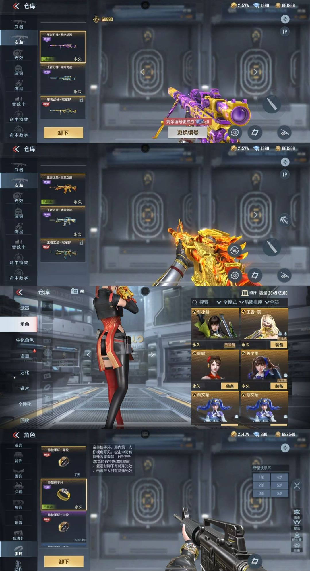 本游戏账号:英雄武器159个, 王者武器20个。军衔: 荣耀元首,段位: 枪圣,拥有:关小雨,萝拉,葵,等7个角色。装备齐全让你拥有完美游戏初体验,特殊装备有:王者之烈、手斧-竞技战魂、王者之神、黑武士烟雾弹、嗜血金鲨、MK5-极光、王者之影烟雾弹、王者之势烟雾弹、王者之影闪光弹、尼泊尔-竞界荣光、王者之圣闪光弹、王者之电、王者之势闪光弹、巴雷特-雷神、AWM-裁决、王者之痕、MK47-机械纪元、尼泊尔-雷霆、王者之击、麒麟刺、MK23-机械纪元、MK5-机械纪元、左轮-竞界荣光、沙鹰-波塞冬、黑武士闪光弹、火麒麟手雷、斯泰尔-蝴蝶、火麒麟闪光弹、巴雷特-枪娘、王者之轮、地狱烈炎、黑龙魂、王者之影、M4A1-竞界荣光、王者之魂、王者之势手雷、王者之啸、闪光弹-金星、尼泊尔-翡翠、风之子、关小雨、等,随意畅选。