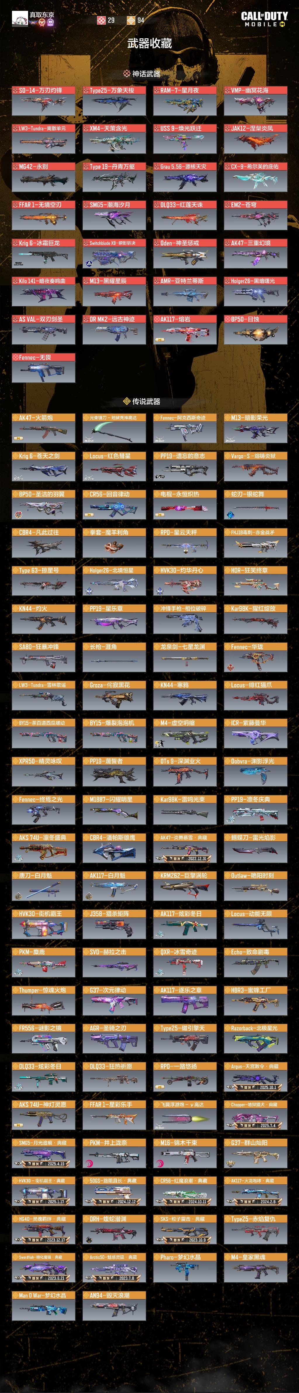 满级SO-14-万刃灼锋 Type25-万象天梭 RAM-7-星月夜 VMP幽冥花海 LW3-Tundra-离散单元 XM4天策含光 USS 9-焕光迁跃 JAK12-涅槃炎凤 BP50-日蚀 MG42-永别了战争Type 19-丹青万壑 CX-9-希尔芙的庇佑 Grau 5.56-源核天灾 AK117-熔岩 FFAR 1-无境空刃 SMG5-潮海汐月 DLQ33-红莲天诛