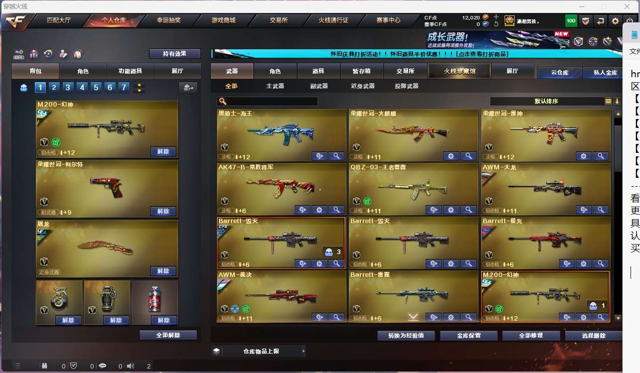 【亮点解析 幻神三件套 裁决三件套 白虎带卡 星神带卡 生化满配】【m200幻神+音效卡+冠军之幻+纸灯龙+usp雷暴*3】【98k星神+音效卡】【6盘龙 6炼狱 6烈龙 斯太尔蝴蝶 】【scar白虎+卡】【qbz金色蔷薇+卡】【hk417朱雀】【火麒麟+卡】【黑龙】【雷神+卡+荣耀之魄+冠军之魄+荣耀世冠+s18冠军】【黑骑士+卡+冠军之势】【毁灭+卡+ag15冠军+cfs2018+荣耀之怒】【极光】【裁决+卡+流光秘银】【荣耀世冠套】 【武器:武圣 青龙 雷霆 王者之心 王者之影 王者之魄 王者之势 王者之幻 王者之鲨 荣耀世冠雷神 荣耀世冠火麒麟 海王 qbz王者蔷薇 王者之怒 王者之光 王者星光 】 【18手呛:修罗*7 天神*3 武圣 雷霆 雷暴*3 荣耀世冠柯尔特*2】 【20刀具:屠龙*3 龙啸 擎天 麒麟刺*4 尼泊尔雷霆 斩神刀雷暴 夜魔 幻灵之峰 王者之锋 王者之啸 王者之击 王者之刺 荣耀世冠龙啸 】 【12雷套:雷霆雷*7 雷暴雷*4 堕天神雷】 【小人呛:火麒麟灵狐 】 【音效卡:星神音效卡 雷神音效卡 幻神音效卡 金色蔷薇音效卡 裁决音效卡 白虎音效卡 毁灭音效卡 黑骑士音效卡 火麒麟音效卡 】 【四防角色:雨棠 王者春 王者瞳闭月羞花 王者魅影 王者葵惊若翩鸿 暗夜审判 职业经理 】