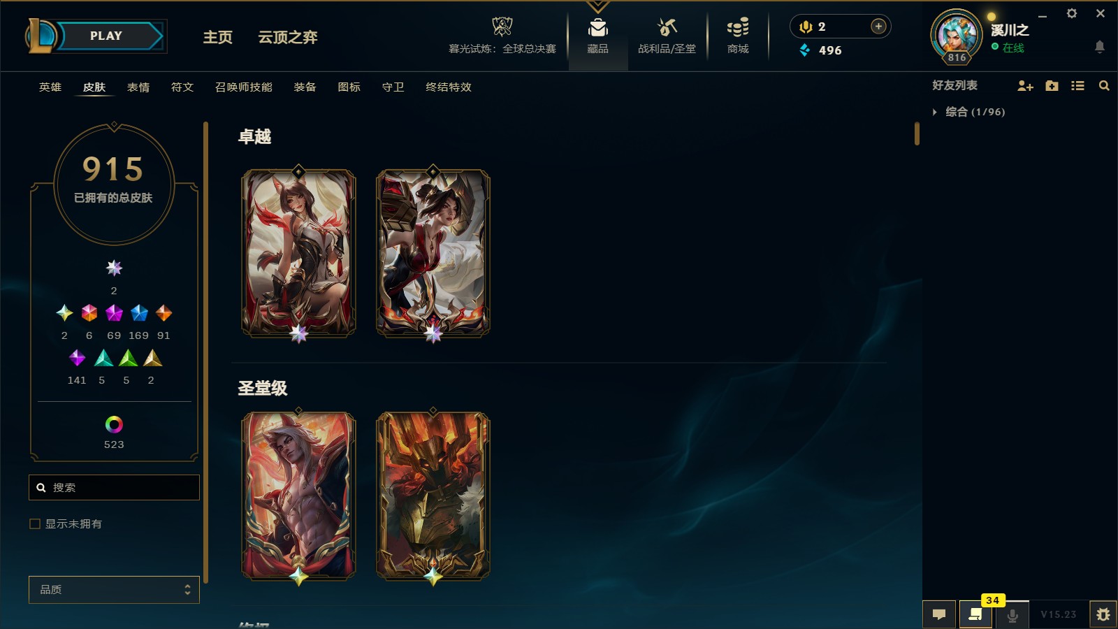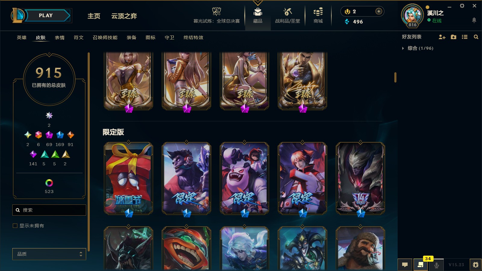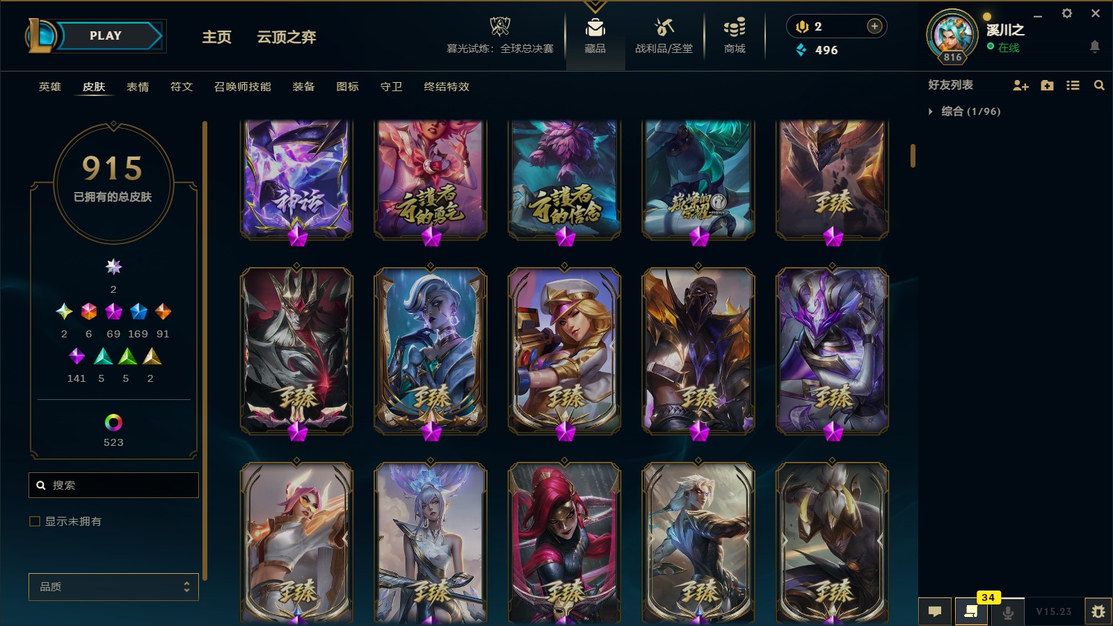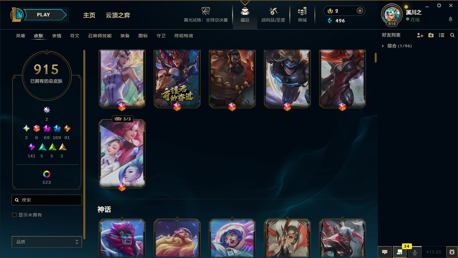 1511皮丨70神话丨5氪金皮 圣堂铁男 腕豪丨神话幻想狐狸 诺手 盖伦丨殿堂狐狸卡莎丨云顶神话发条