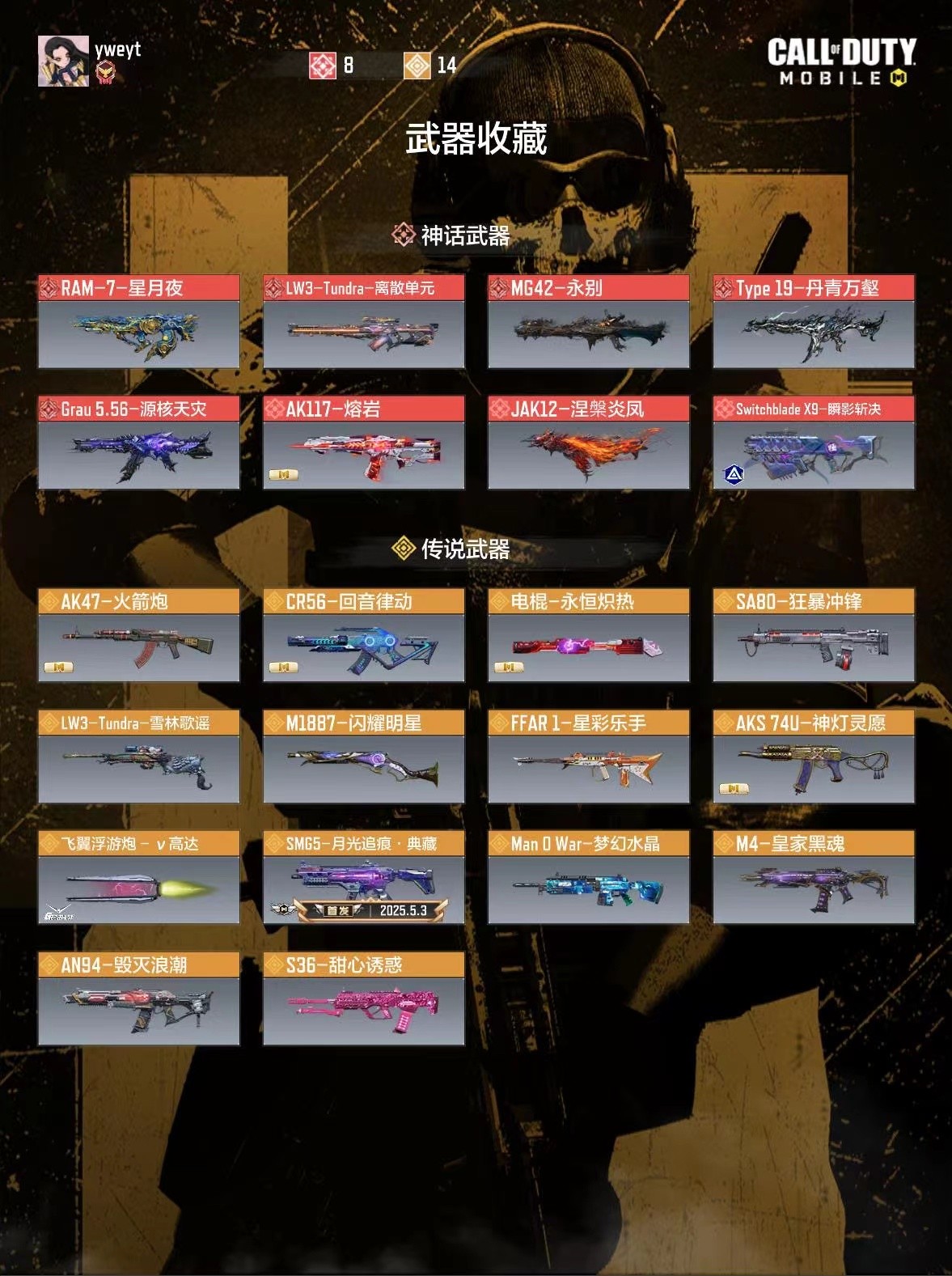 8神话武器,1典藏武器,13传说武器,322史诗武器;神话武器:LW3-Tundra-离散单元,MG42-永别,AK117-熔岩,RAM-7-星月夜,Grau5.56-源核天灾,Type19-丹青万壑,SwitchbladeX9-瞬影斩决,JAK12-涅槃炎凤;典藏武器:SMG5-月光追痕·典藏