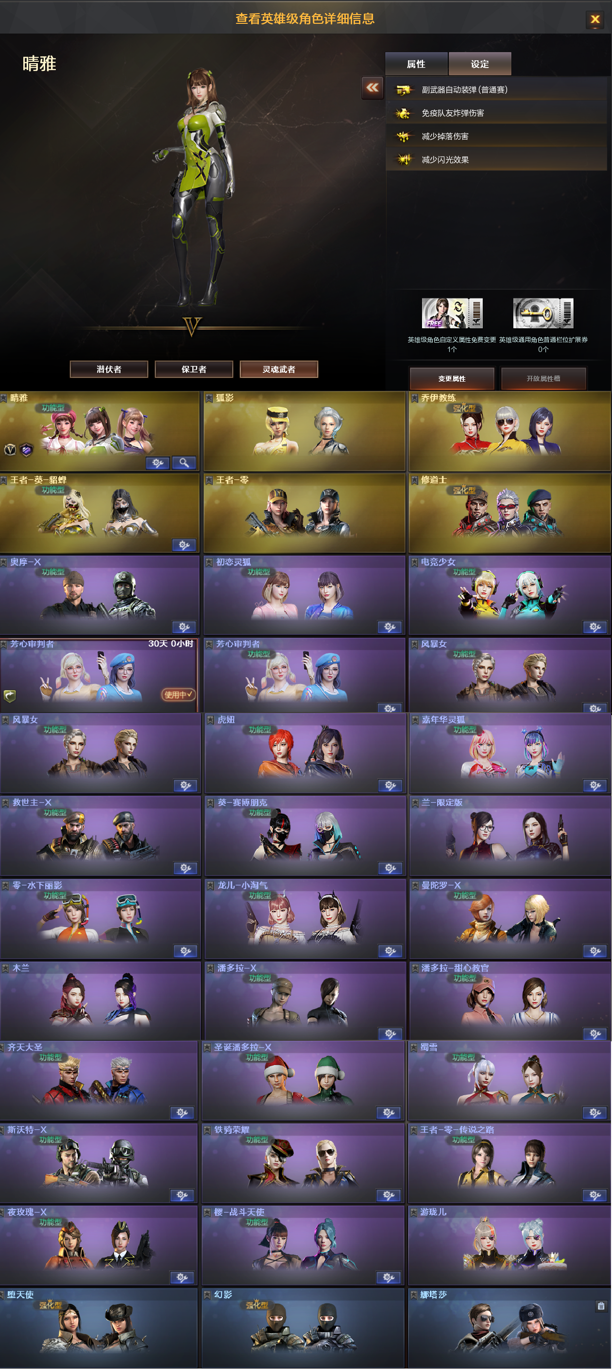 稀有角色:晴雅(四防减少闪光效果/免疫队友炸弹伤害/减少掉落伤害/副武器自动装弹)、乔伊教练、狐影、王者葵貂蝉、王者零、修道士、芳心审判者、电竞少女、零水下丽影、兰限定版、王者零传说之路