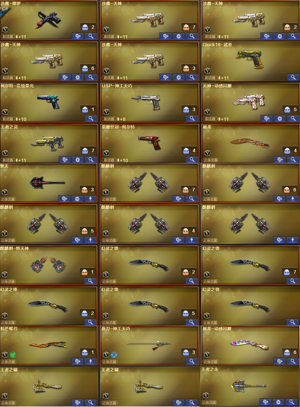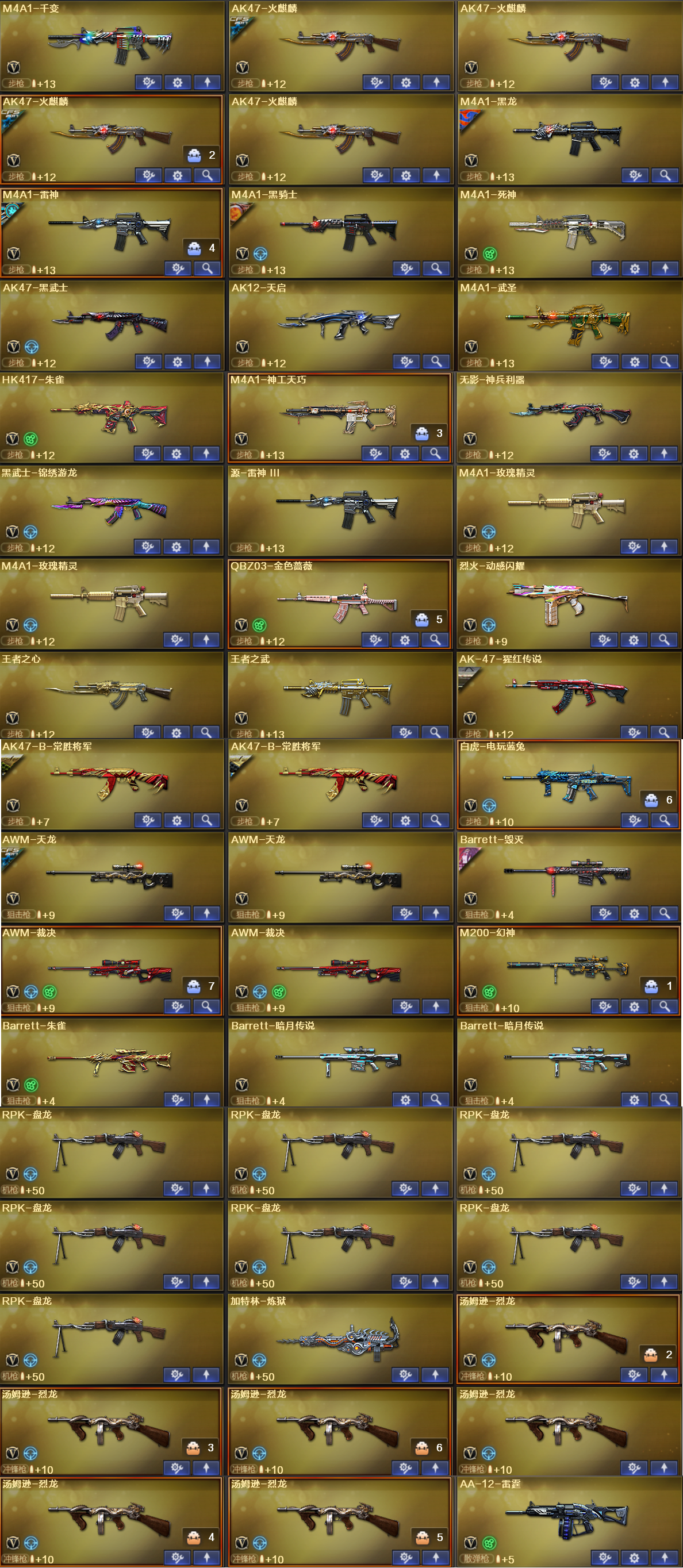 稀有武器:M200幻神、Barrett朱雀、盘龙X7、炼狱、烈龙X6、暗月传说X2、QBZ金色蔷薇、白虎电玩蓝兔、天龙X2、毁灭、裁决X2、千变、火麒麟X4、黑龙、雷神、黑骑士、死神、黑武士、天启、武圣、朱雀、神工天巧、无影神兵利器、黑武士锦绣游龙、玫瑰精灵x2、烈火动感闪耀、天神X4、Glock18武圣、柯尔特竞技荣光、USP神工天巧、天神动感闪耀、荣耀世冠柯尔特、屠龙、擎天、麒麟刺X5、麒麟刺堕天神、幻灵之锋X5、炽芒蝶刃、唐刀神工天巧、屠龙动感闪耀