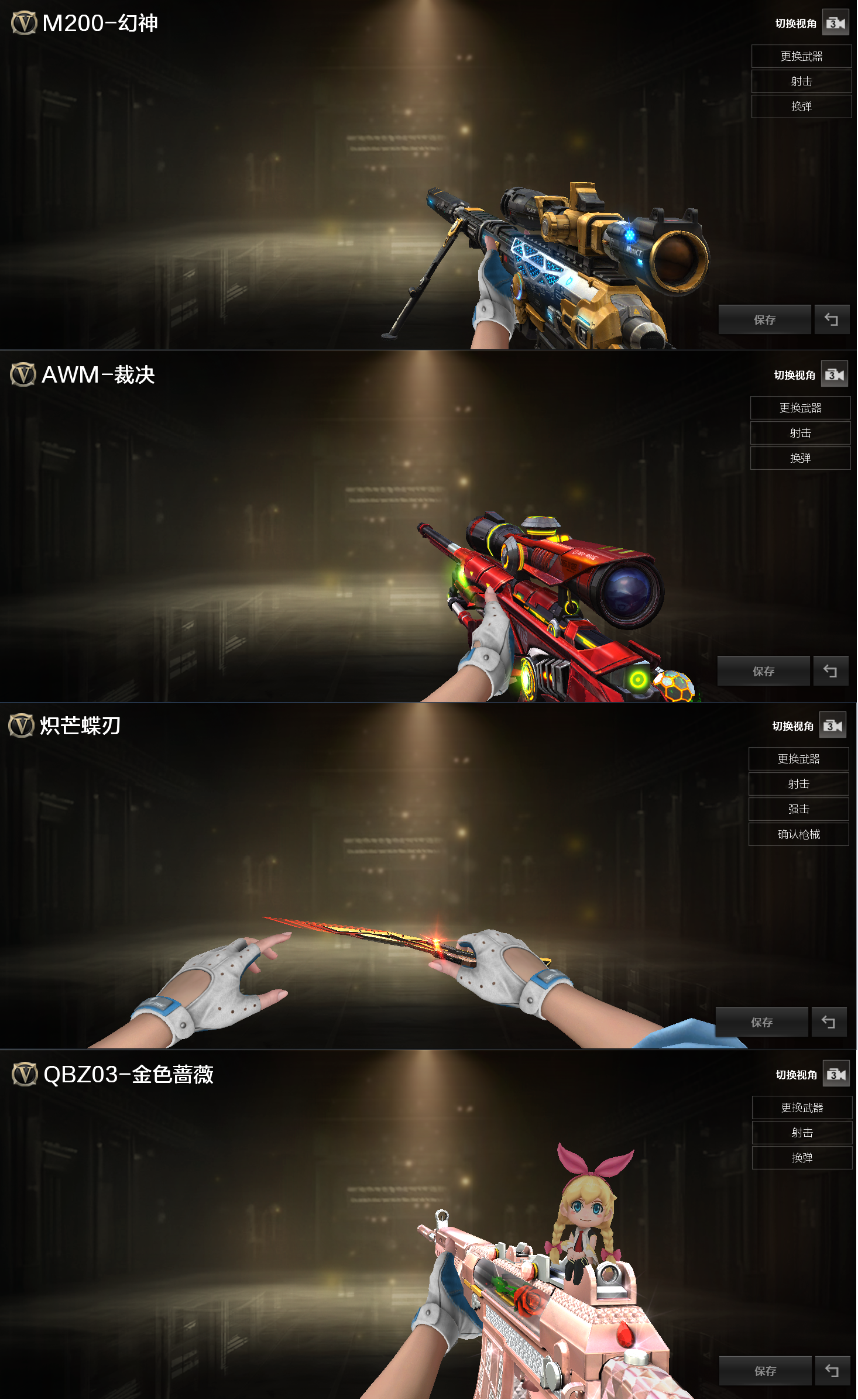 小人枪及特殊武器:M4A1雷神精英刀锋、炼狱迷你小钢、致命乱世超越MAX、异变清道夫、巴雷特零水下丽影、斯太尔蝴蝶、金刚伞电玩蓝兔、AWM灵狐15周年嘉年华、COP旗袍、蝴蝶刀枪王排位、魔能飞环曼陀罗、清刚