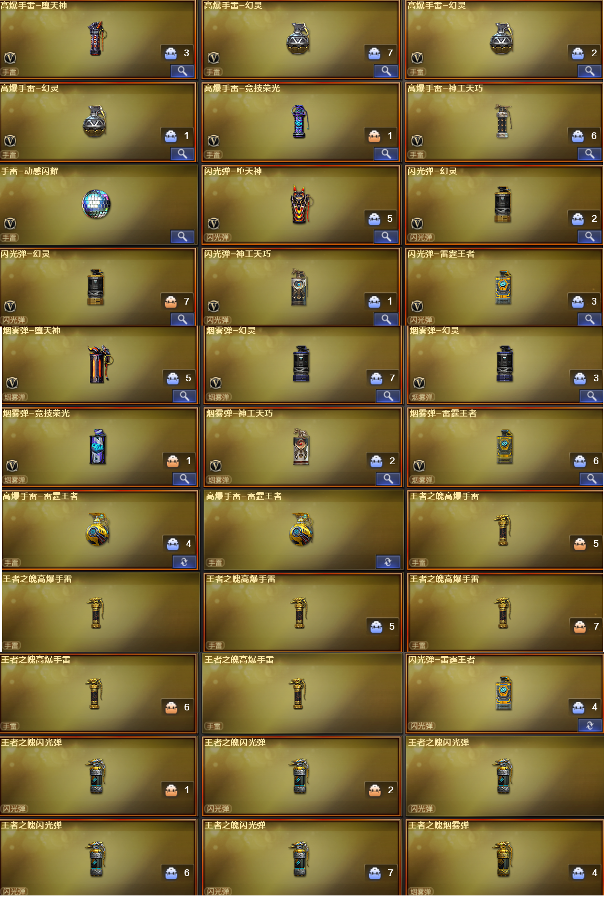 投掷武器及套装:堕天神套、幻灵套X3、竞技荣光套、神功天巧套、雷霆王者套