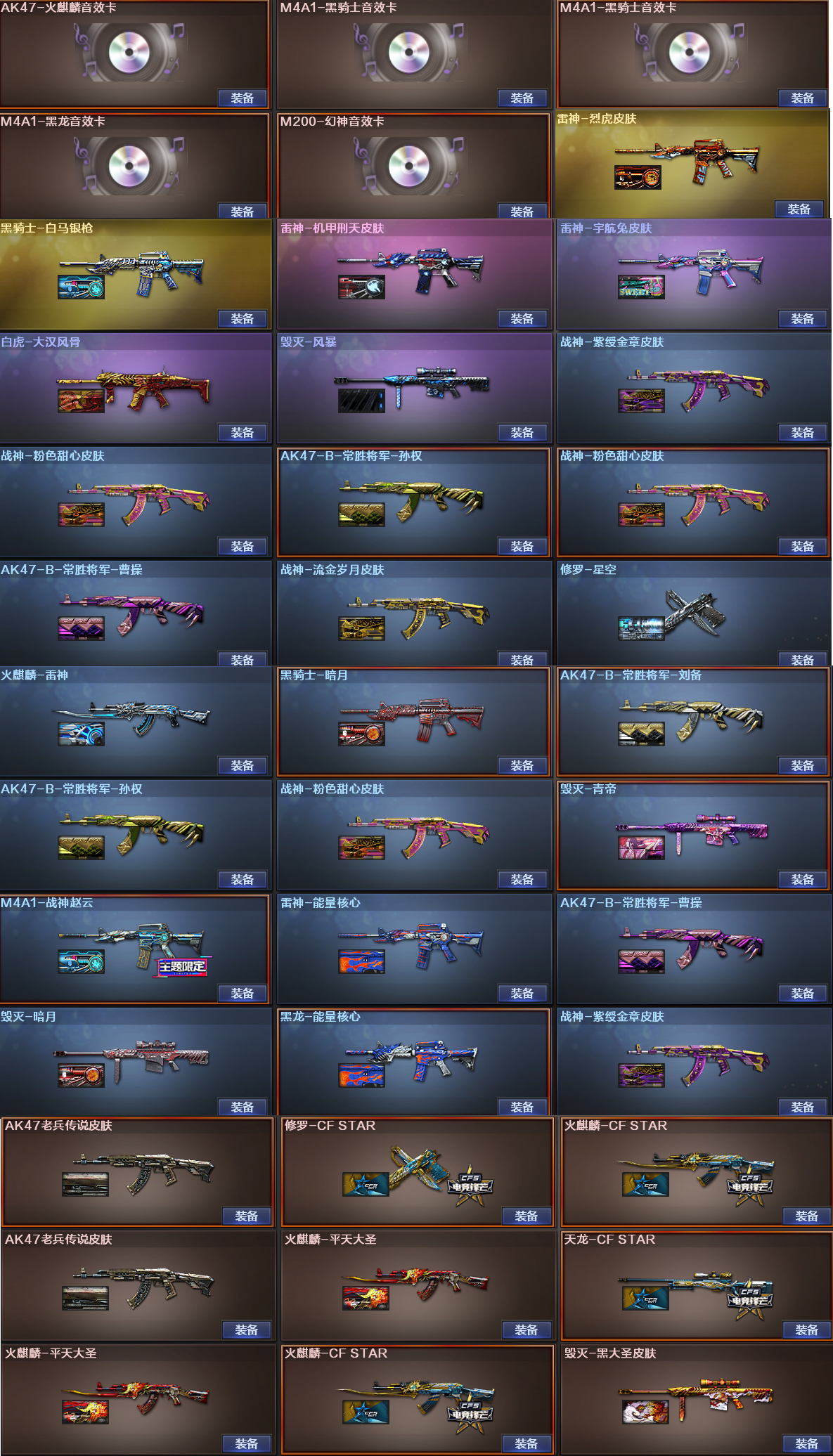稀有皮肤:雷神烈虎皮肤/战神赵云/宇航兔皮肤/机甲刑天皮肤/能量核心皮肤、黑骑士白马银枪/暗月皮肤、修罗星空皮肤/CF STAR皮肤、火麒麟雷神皮肤/CF STAR皮肤X2/平天大圣皮肤X2、毁灭青帝/黑大圣皮肤/暗月皮肤/风暴皮肤、黑龙能量核心皮肤、天龙CF STAR皮肤