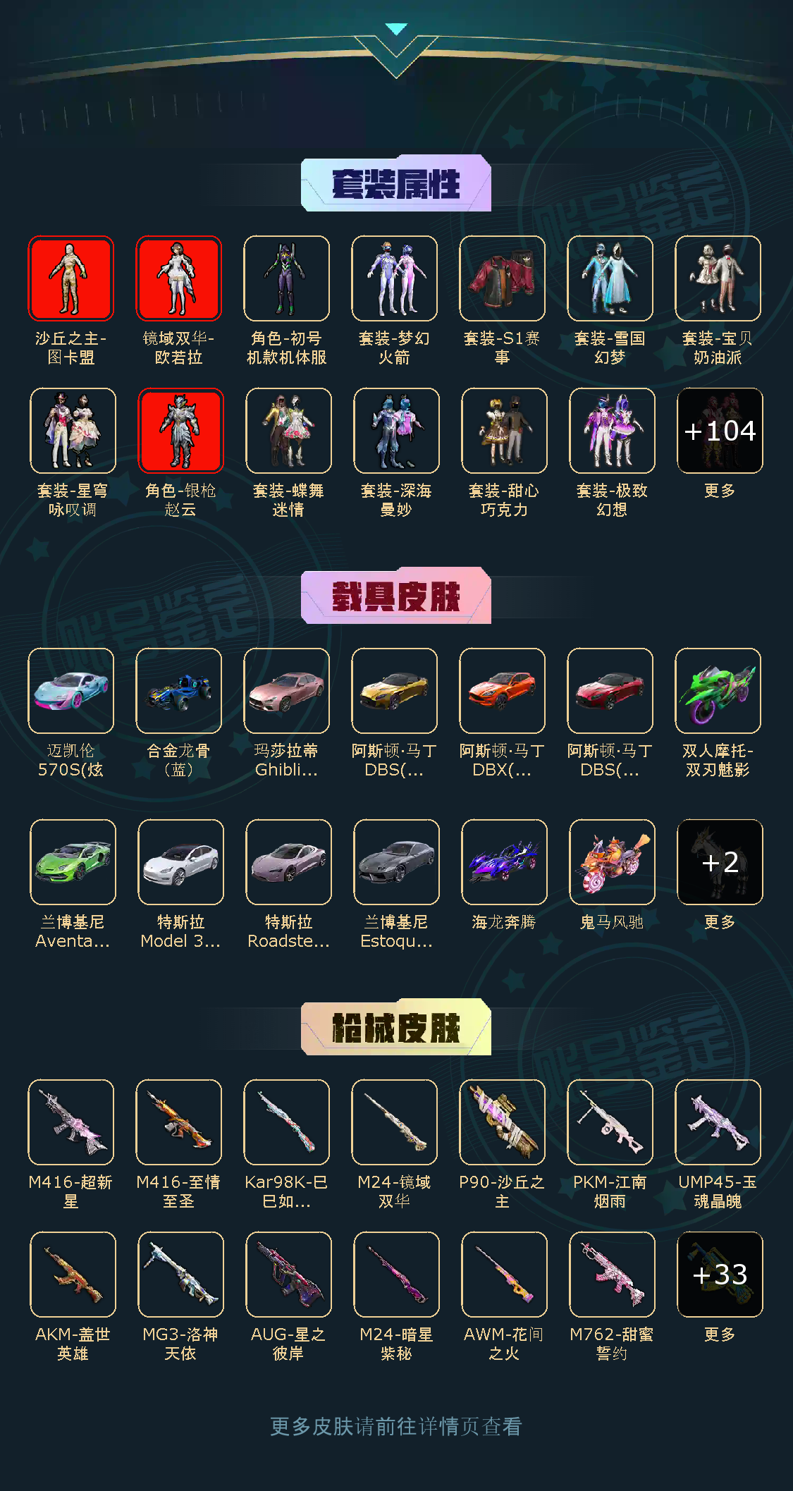 100粉,100载具,100特效枪,400套装,30王牌印记 UZI-绮梦青鸾/AKM-甜心宝贝/DP-28-扶摇飞仙/SCAR-L-梦幻火箭/SCAR-L-童趣迷兔/Kar98K-伏魔团/SKS-碧影闪光/M416-风花雪月/AUG-星之彼岸/SCAR-L-甜梦小狐/AWM-花间之火/M762-甜心娃娃/汤姆逊-怪笑疯兔/AWM-焰龙焚天/Vector-红伞翩翩/SKS-诡面斩/MG3-炙焰牛王/M762-激战未来/GROZA-香水柠檬/AWM-橘柚倾心/M416-心之恋语/平底锅-林间仙鹿/M16A4-葫芦兄弟/Mini14-荧光虫舞/M416-五爪金龙/M24-暗星紫秘/DP-28-枪炮玫瑰/DP-28-幻梦音符/AKM-炫紫旋律/Mini14-绚金瑰梦/MG3-洛神天依/GROZA-焦糖拿铁/SCAR-L-青春物语/M249-古战神甲/M762-冷魅冰骑/AKM-百合蜜语/UZI-筑梦精灵/SLR-暗夜玫瑰/S12K-海渊国主/VSS-烈焰拳霸/Kar98K-暗翼战神/UMP45-雪国精灵/M762-甜蜜誓约/UMP45-相思残雪/SCAR-L-机甲封神/M24-星之信仰/UMP45-恐龙拽拽/Mini14-龙虾霸霸/M249-蓝莓炮弹/野牛-流星咚咚/AKM-梦之光华/Kar98K-绿意幻情/路特斯EVIJA(星际黄)/兰博基尼Aventador(翡翠绿)/玛莎拉蒂Ghibli(金)/萌喵橘座/双人摩托-双刃魅影(绿)/阿斯顿·马丁DBX(橙)/特斯拉Model X(珍珠白)/俏皮小熊猫/路特斯ELETRE(冰川蓝)/兰博基尼URUS(炫光金)/特斯拉Roadster(尊享铂)/快艇-自由的鲸/海龙奔腾/特斯拉Roadster(沁心粉)/特斯拉Model 3(珍珠白)/玛莎拉蒂Ghibli(蓝)/阿斯顿·马丁DBS(红)/双人摩托-梦幻火箭/兰博基尼URUS(尊享铂)/特斯拉Model X(奇幻紫)/特斯拉Cybertruck(极昼黑)/特斯拉Cybertruck(荒芜蓝)/兰博基尼Estoque(炫光金)/金龙耀世/快艇-塞莎KL27(深潜蓝)/焰龙咆哮/兰博基尼URUS(明艳黄)/快艇-塞莎KL27(霓虹粉)/特斯拉Cybertruck(镭光铂)/双人摩托-双刃魅影(红)/兰博基尼Estoque(银翼灰)/双人摩托-双刃魅影(金)/合金龙骨(蓝)/灵鼠银迹/阿斯顿·马丁DBS(绿)/阿斯顿·马丁DBX(金)/特斯拉Model 3(奇幻紫)/特斯拉Model 3(冷光银)/合金龙骨(绿)/特斯拉Roadster(水滴蓝)/阿斯顿·马丁DBS(金)/路特斯ELETRE(花绽灰)/极速兔兔/鬼马风驰/南瓜骑士/合金龙骨(红)/兰博基尼Estoque(尊享铂)/玛莎拉蒂Ghibli(粉)/兰博基尼SVJ(尊享铂)/兰博基尼SVJ(炫光金)/软萌羊咩咩/快艇-塞莎KL27(鲸之蓝)/阿斯顿·马丁DBX(蓝)/特斯拉Model X(冷光银)