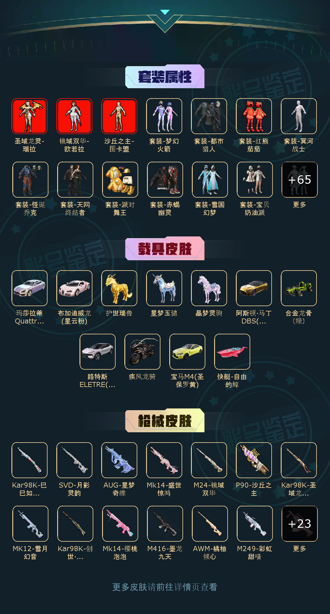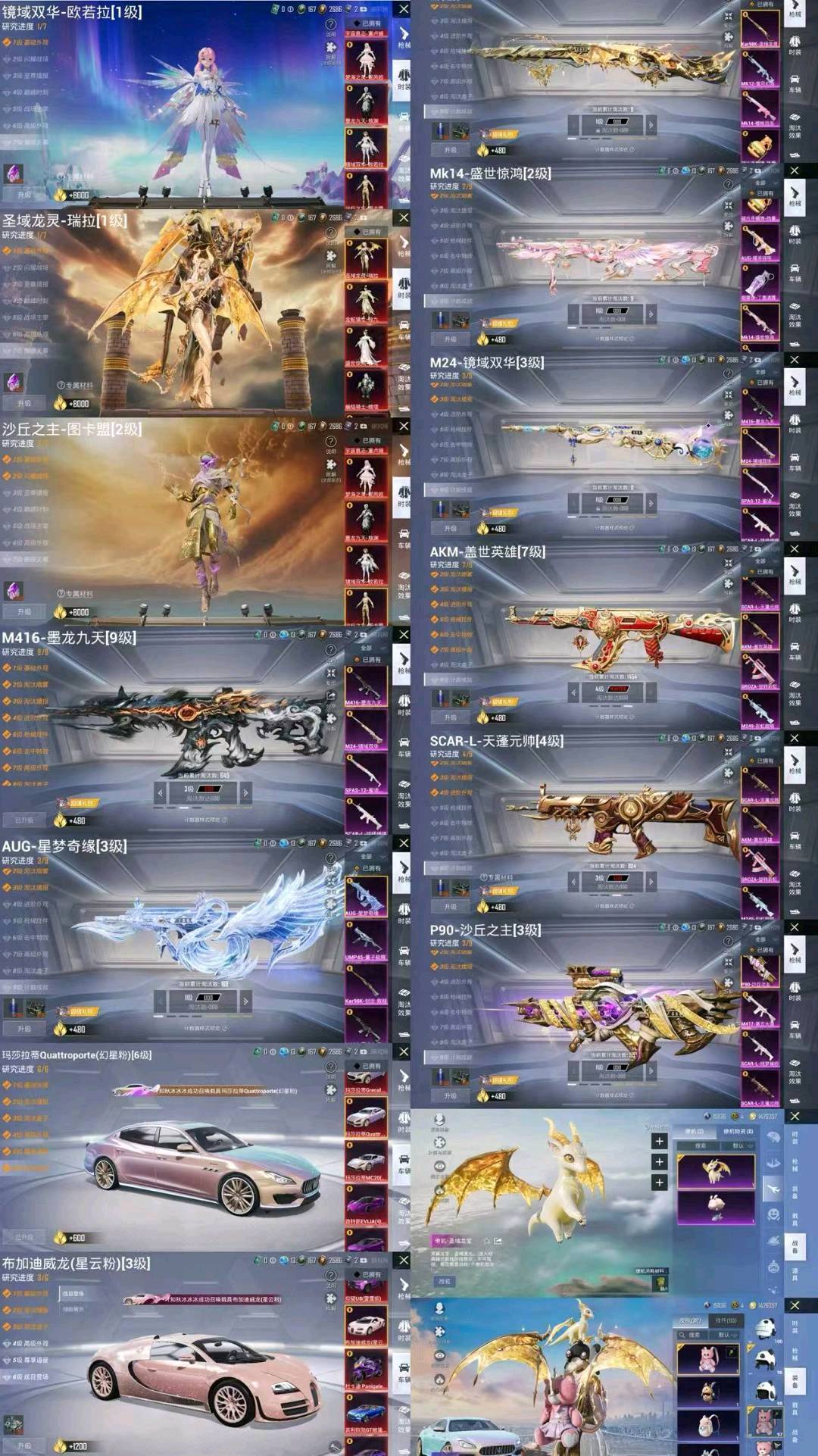 100粉,100载具,100特效枪,400套装,30王牌印记 UZI-绮梦青鸾/AKM-甜心宝贝/DP-28-扶摇飞仙/SCAR-L-梦幻火箭/SCAR-L-童趣迷兔/Kar98K-伏魔团/SKS-碧影闪光/M416-风花雪月/AUG-星之彼岸/SCAR-L-甜梦小狐/AWM-花间之火/M762-甜心娃娃/汤姆逊-怪笑疯兔/AWM-焰龙焚天/Vector-红伞翩翩/SKS-诡面斩/MG3-炙焰牛王/M762-激战未来/GROZA-香水柠檬/AWM-橘柚倾心/M416-心之恋语/平底锅-林间仙鹿/M16A4-葫芦兄弟/Mini14-荧光虫舞/M416-五爪金龙/M24-暗星紫秘/DP-28-枪炮玫瑰/DP-28-幻梦音符/AKM-炫紫旋律/Mini14-绚金瑰梦/MG3-洛神天依/GROZA-焦糖拿铁/SCAR-L-青春物语/M249-古战神甲/M762-冷魅冰骑/AKM-百合蜜语/UZI-筑梦精灵/SLR-暗夜玫瑰/S12K-海渊国主/VSS-烈焰拳霸/Kar98K-暗翼战神/UMP45-雪国精灵/M762-甜蜜誓约/UMP45-相思残雪/SCAR-L-机甲封神/M24-星之信仰/UMP45-恐龙拽拽/Mini14-龙虾霸霸/M249-蓝莓炮弹/野牛-流星咚咚/AKM-梦之光华/Kar98K-绿意幻情/路特斯EVIJA(星际黄)/兰博基尼Aventador(翡翠绿)/玛莎拉蒂Ghibli(金)/萌喵橘座/双人摩托-双刃魅影(绿)/阿斯顿·马丁DBX(橙)/特斯拉Model X(珍珠白)/俏皮小熊猫/路特斯ELETRE(冰川蓝)/兰博基尼URUS(炫光金)/特斯拉Roadster(尊享铂)/快艇-自由的鲸/海龙奔腾/特斯拉Roadster(沁心粉)/特斯拉Model 3(珍珠白)/玛莎拉蒂Ghibli(蓝)/阿斯顿·马丁DBS(红)/双人摩托-梦幻火箭/兰博基尼URUS(尊享铂)/特斯拉Model X(奇幻紫)/特斯拉Cybertruck(极昼黑)/特斯拉Cybertruck(荒芜蓝)/兰博基尼Estoque(炫光金)/金龙耀世/快艇-塞莎KL27(深潜蓝)/焰龙咆哮/兰博基尼URUS(明艳黄)/快艇-塞莎KL27(霓虹粉)/特斯拉Cybertruck(镭光铂)/双人摩托-双刃魅影(红)/兰博基尼Estoque(银翼灰)/双人摩托-双刃魅影(金)/合金龙骨(蓝)/灵鼠银迹/阿斯顿·马丁DBS(绿)/阿斯顿·马丁DBX(金)/特斯拉Model 3(奇幻紫)/特斯拉Model 3(冷光银)/合金龙骨(绿)/特斯拉Roadster(水滴蓝)/阿斯顿·马丁DBS(金)/路特斯ELETRE(花绽灰)/极速兔兔/鬼马风驰/南瓜骑士/合金龙骨(红)/兰博基尼Estoque(尊享铂)/玛莎拉蒂Ghibli(粉)/兰博基尼SVJ(尊享铂)/兰博基尼SVJ(炫光金)/软萌羊咩咩/快艇-塞莎KL27(鲸之蓝)/阿斯顿·马丁DBX(蓝)/特斯拉Model X(冷光银)