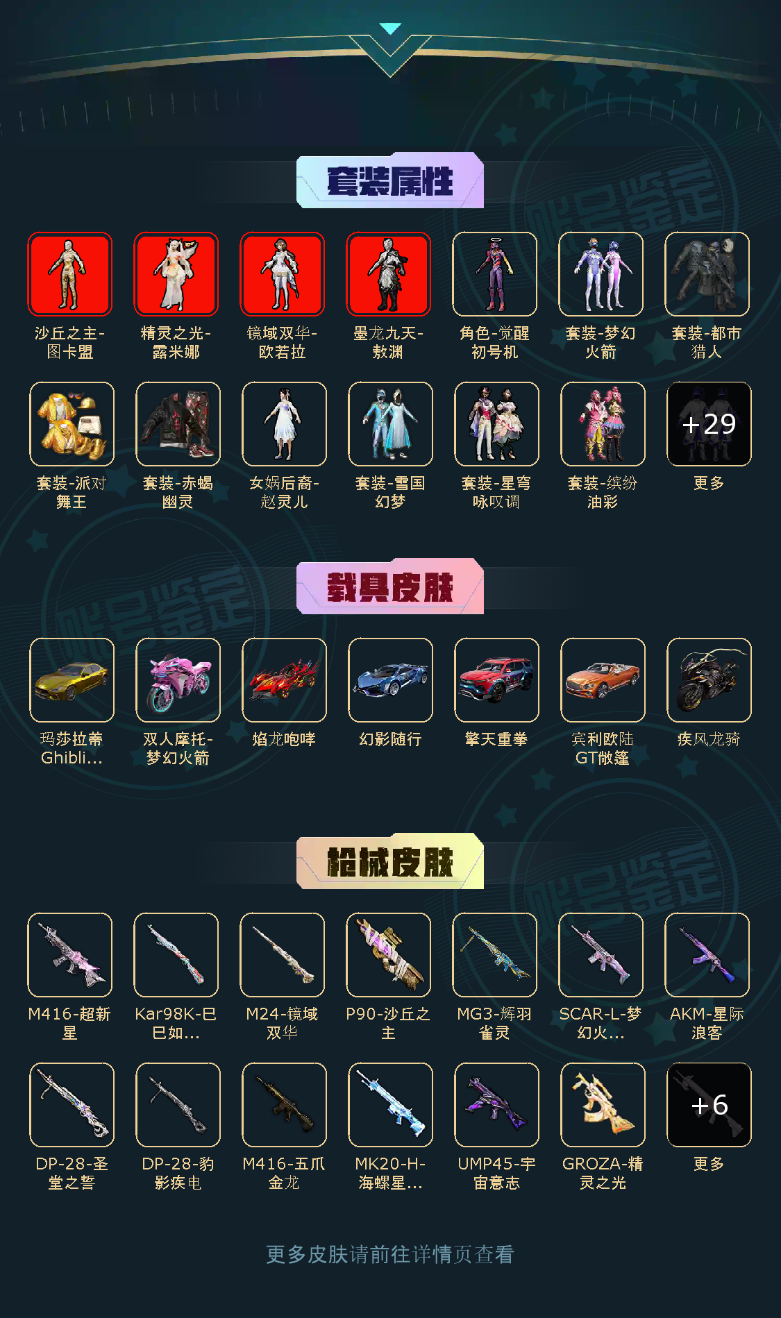 100粉,100载具,100特效枪,400套装,30王牌印记 UZI-绮梦青鸾/AKM-甜心宝贝/DP-28-扶摇飞仙/SCAR-L-梦幻火箭/SCAR-L-童趣迷兔/Kar98K-伏魔团/SKS-碧影闪光/M416-风花雪月/AUG-星之彼岸/SCAR-L-甜梦小狐/AWM-花间之火/M762-甜心娃娃/汤姆逊-怪笑疯兔/AWM-焰龙焚天/Vector-红伞翩翩/SKS-诡面斩/MG3-炙焰牛王/M762-激战未来/GROZA-香水柠檬/AWM-橘柚倾心/M416-心之恋语/平底锅-林间仙鹿/M16A4-葫芦兄弟/Mini14-荧光虫舞/M416-五爪金龙/M24-暗星紫秘/DP-28-枪炮玫瑰/DP-28-幻梦音符/AKM-炫紫旋律/Mini14-绚金瑰梦/MG3-洛神天依/GROZA-焦糖拿铁/SCAR-L-青春物语/M249-古战神甲/M762-冷魅冰骑/AKM-百合蜜语/UZI-筑梦精灵/SLR-暗夜玫瑰/S12K-海渊国主/VSS-烈焰拳霸/Kar98K-暗翼战神/UMP45-雪国精灵/M762-甜蜜誓约/UMP45-相思残雪/SCAR-L-机甲封神/M24-星之信仰/UMP45-恐龙拽拽/Mini14-龙虾霸霸/M249-蓝莓炮弹/野牛-流星咚咚/AKM-梦之光华/Kar98K-绿意幻情/路特斯EVIJA(星际黄)/兰博基尼Aventador(翡翠绿)/玛莎拉蒂Ghibli(金)/萌喵橘座/双人摩托-双刃魅影(绿)/阿斯顿·马丁DBX(橙)/特斯拉Model X(珍珠白)/俏皮小熊猫/路特斯ELETRE(冰川蓝)/兰博基尼URUS(炫光金)/特斯拉Roadster(尊享铂)/快艇-自由的鲸/海龙奔腾/特斯拉Roadster(沁心粉)/特斯拉Model 3(珍珠白)/玛莎拉蒂Ghibli(蓝)/阿斯顿·马丁DBS(红)/双人摩托-梦幻火箭/兰博基尼URUS(尊享铂)/特斯拉Model X(奇幻紫)/特斯拉Cybertruck(极昼黑)/特斯拉Cybertruck(荒芜蓝)/兰博基尼Estoque(炫光金)/金龙耀世/快艇-塞莎KL27(深潜蓝)/焰龙咆哮/兰博基尼URUS(明艳黄)/快艇-塞莎KL27(霓虹粉)/特斯拉Cybertruck(镭光铂)/双人摩托-双刃魅影(红)/兰博基尼Estoque(银翼灰)/双人摩托-双刃魅影(金)/合金龙骨(蓝)/灵鼠银迹/阿斯顿·马丁DBS(绿)/阿斯顿·马丁DBX(金)/特斯拉Model 3(奇幻紫)/特斯拉Model 3(冷光银)/合金龙骨(绿)/特斯拉Roadster(水滴蓝)/阿斯顿·马丁DBS(金)/路特斯ELETRE(花绽灰)/极速兔兔/鬼马风驰/南瓜骑士/合金龙骨(红)/兰博基尼Estoque(尊享铂)/玛莎拉蒂Ghibli(粉)/兰博基尼SVJ(尊享铂)/兰博基尼SVJ(炫光金)/软萌羊咩咩/快艇-塞莎KL27(鲸之蓝)/阿斯顿·马丁DBX(蓝)/特斯拉Model X(冷光银)