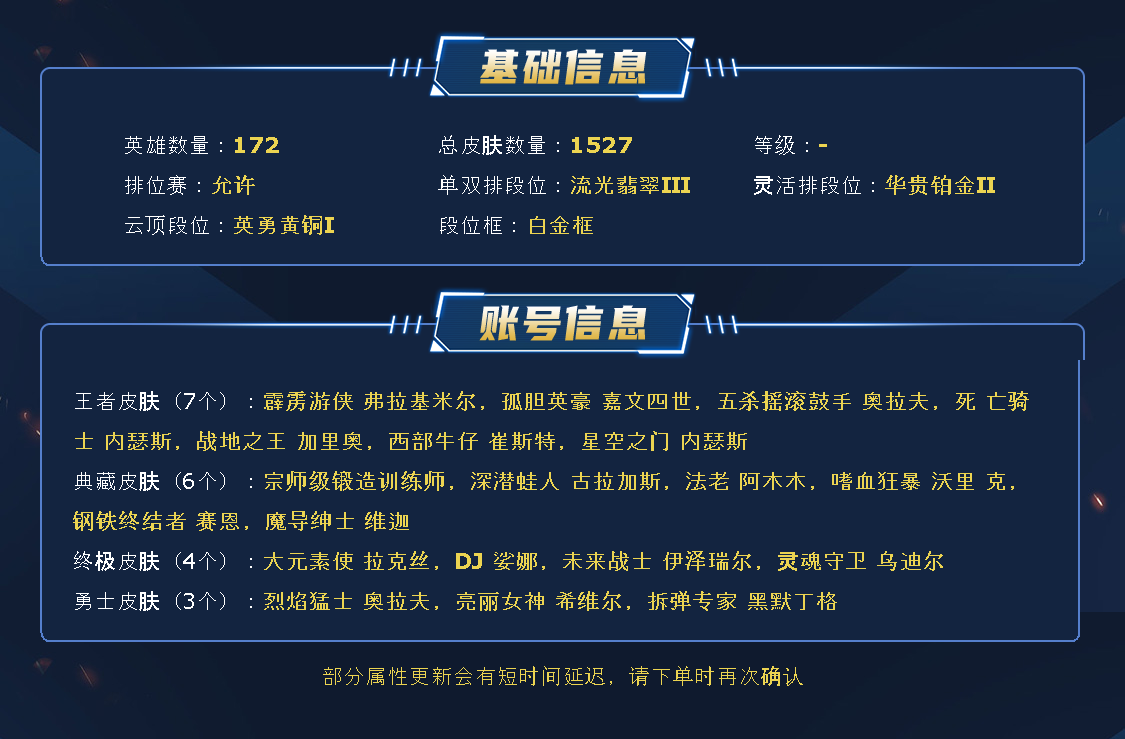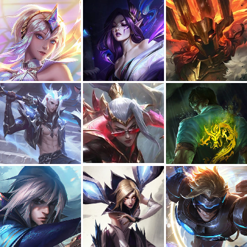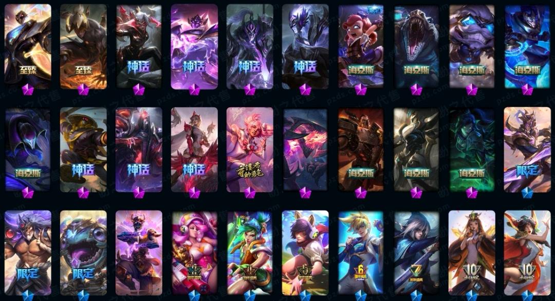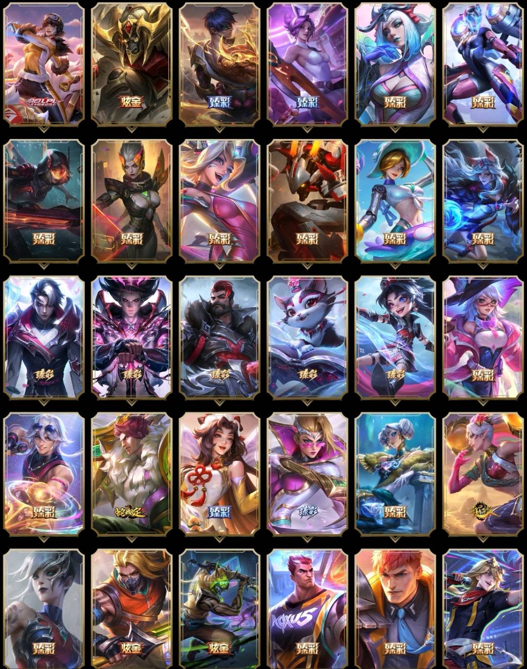 【传说皮肤】花仙女王卡尔玛 钢铁军团盖伦 灵魂莲华瑟提 战地巨兽科加斯 邪鸦魅影乐芙兰 源计划超体莫德凯撒 神龙尊者夜月幻龙亚索 星之守护者阿狸 女校长菲奥娜 暗星尊烬 西部魔影大小姐蕾欧娜 陆地王者4WD布里茨 星之守护者拉克丝 最终BOSS维迦 偶像歌手阿狸 屠龙勇士潘森 恶魔男爵瑞兹 恶魔之刃泰达米尔 神拳李青 约德尔国队长提莫 黎明使者锐雯 源计划林易 女主播迦娜 律政大亨蒙多 奥德赛凯隐 驯龙炮手崔丝塔娜 大天使长米迦勒凯尔 烈焰雄心崔丝塔娜 冰川巨兽墨菲特 西部天使赛娜 战地机甲厄加特 合金巨兽努努和威朗普 铁哥们儿奥拉夫 炼狱魔犬内瑟斯 黯黑魔龙希瓦娜 源计划联合艾希 金牌主播德莱文 银河魔装机神兰博 冰霜亚龙希瓦娜 黑夜使者亚索 苹果机器人布里茨 钢铁之翼凯尔 驯龙学者黑默丁格 真实伤害艾克 提莫约德尔人的一大步 第三类接触黑默丁格 影执事劫 星之守护者霞 战斗学院伊泽瑞尔 符文战熊沃利贝尔 神龙尊者圣龙李青 枯萎之壤泽拉斯 苍穹之光韦鲁斯 魔幻卡牌崔斯特 星之守护者卡莎 冰霜之刃艾瑞莉娅 上古战魂魔腾 战场女武神凯尔 双重冰晶艾尼维亚 太空律动猫猫布里和里茨 霸天异形卡兹克 神王盖伦 泳池派对吉格斯 欧米伽小队幽灵特工 女皇艾希 灵魂莲华锤石 未来战士凯特琳 天煞劫 星之守护者洛 鬼魂新娘莫甘娜 宇航员诺提勒斯 西部魔影卢锡安 黎明使者永恩 红色男爵库奇 死亡骑士盖伦 蔷薇绅士杰斯 地狱之门卫士加里奥 丧尸布兰德 焰尾妖狐阿狸 黯晶凤凰艾尼维亚 神王德莱厄斯 战斗学院凯特琳 霸天零式赛恩 女警狙击凯特琳 西部天使艾希 灌篮高手德莱厄斯 青花瓷伊泽瑞尔