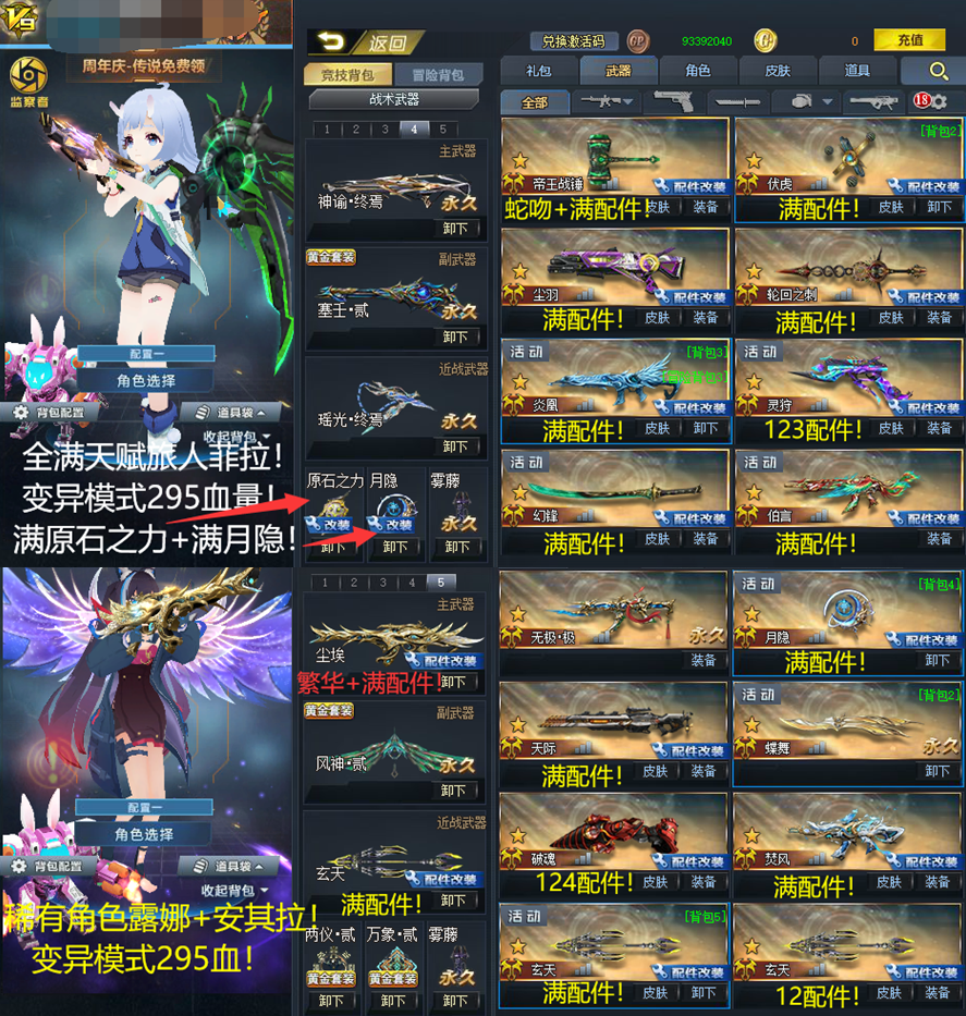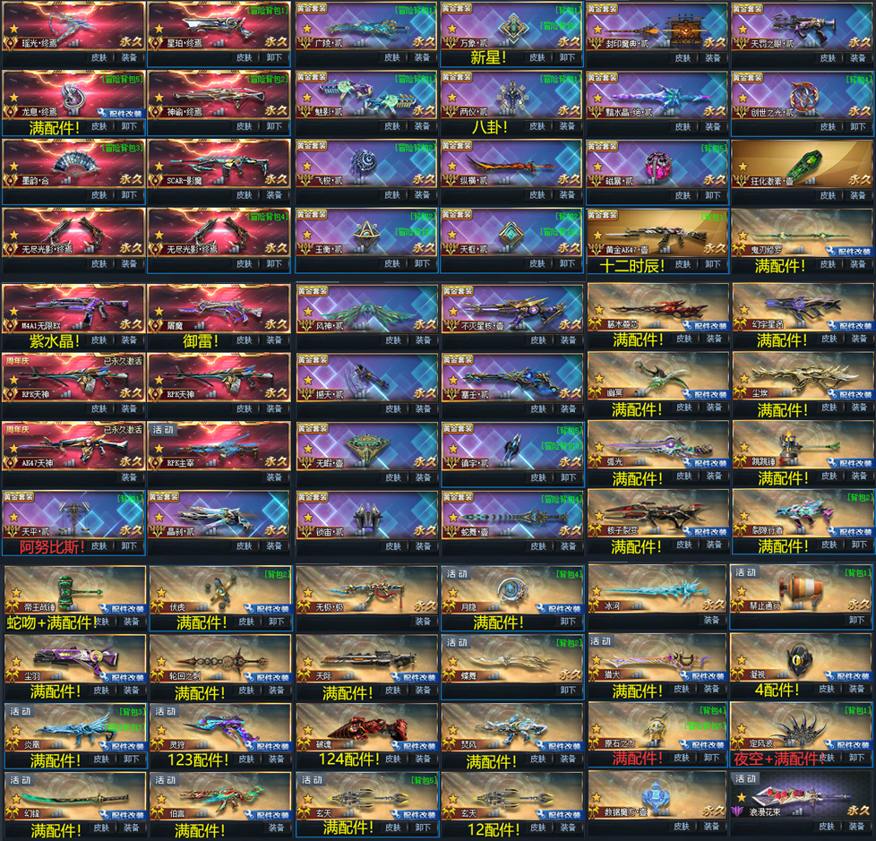 满配件英雄级武器:鬼刃修罗!藤木蔓芯!幻宇星涡!幽冥!尘埃!弧光!跳跳锤!核子裂变!裂隙行者!帝王战锤!伏虎!无极极!月隐!冰河!禁止通行!尘羽!轮回之刺!天际!蝶舞!猎犬!4配件凝视!炎凰!123灵狩!124破魂!焚风!原石之力!夜空定风波!幻锋!伯言!玄天…